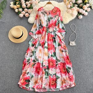 Bohemian Floral Chiffon Midi Dress Women Sexy Slash Neck Ruffle Short Sleeve A-line Printed Vacation Beach Vestidos Robe