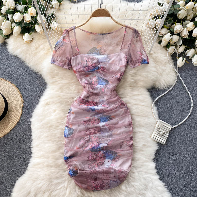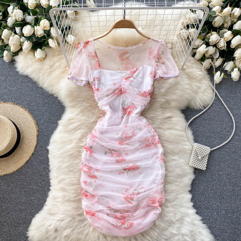 Cheap Dresses, Buy Quality Women’s Clothing Directly from China Suppliers:Black/Pink Sexy Floral Draped Mesh Mini Bodycon Dress Women Square Collar Short Sleeve High Waist Club Party Vestidos Female New