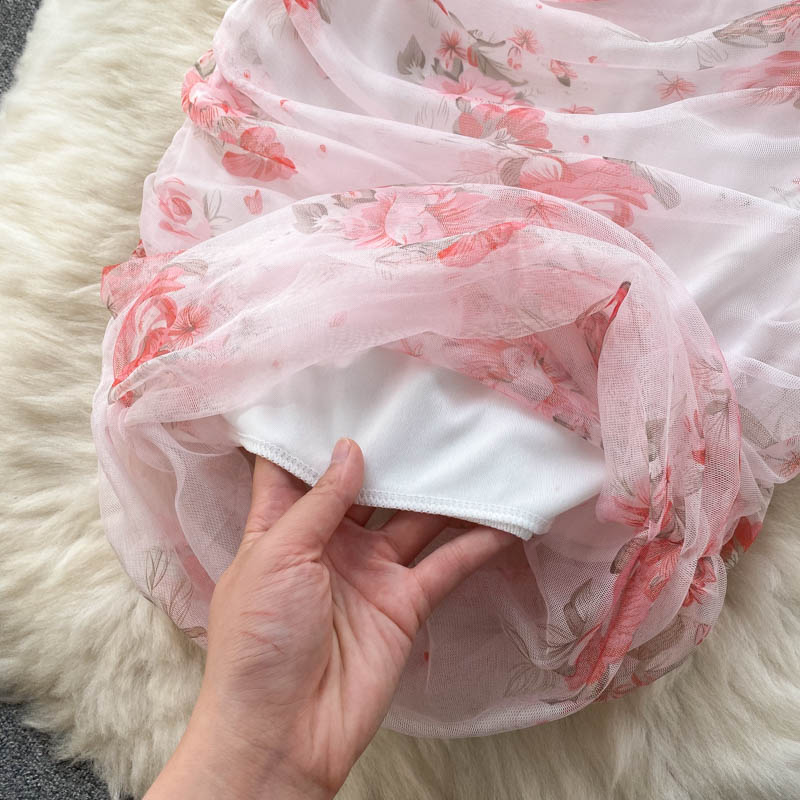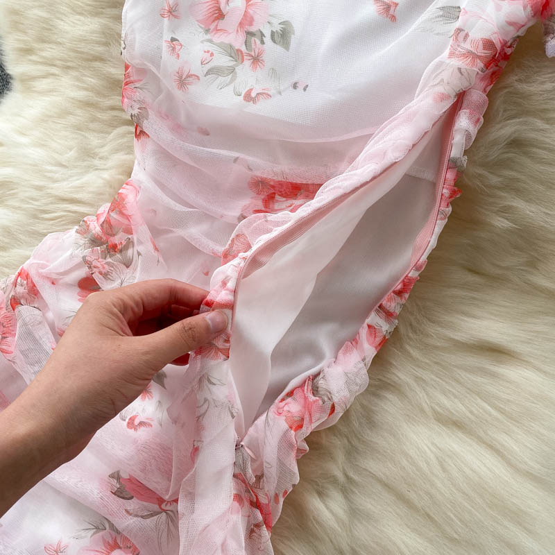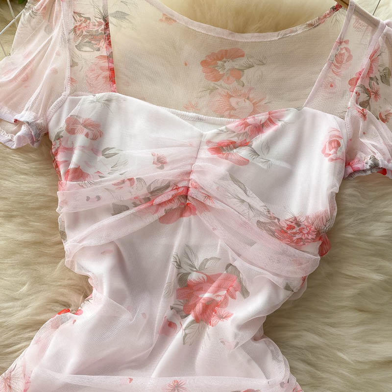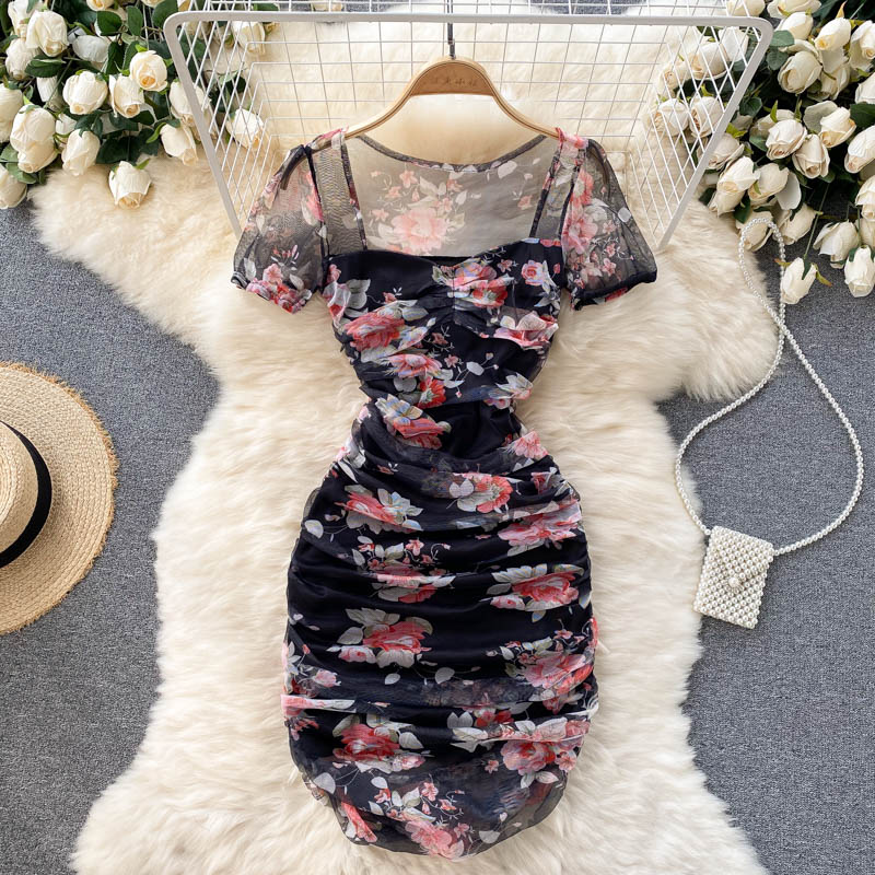 Black/Pink Sexy Floral Draped Mesh Mini Bodycon Dress Women Square Collar Short Sleeve High Waist Club Party Vestidos Female New