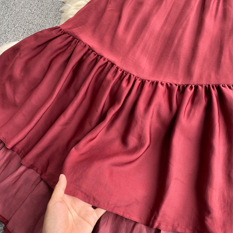 Women Red Spaghetti Strap Midi Dress Sexy V-Neck High Waist Sleeveless Ruffle Casual Vestidos Elegant Beach Party Robe New