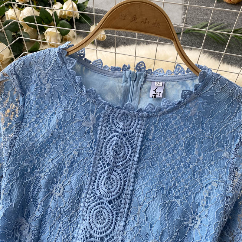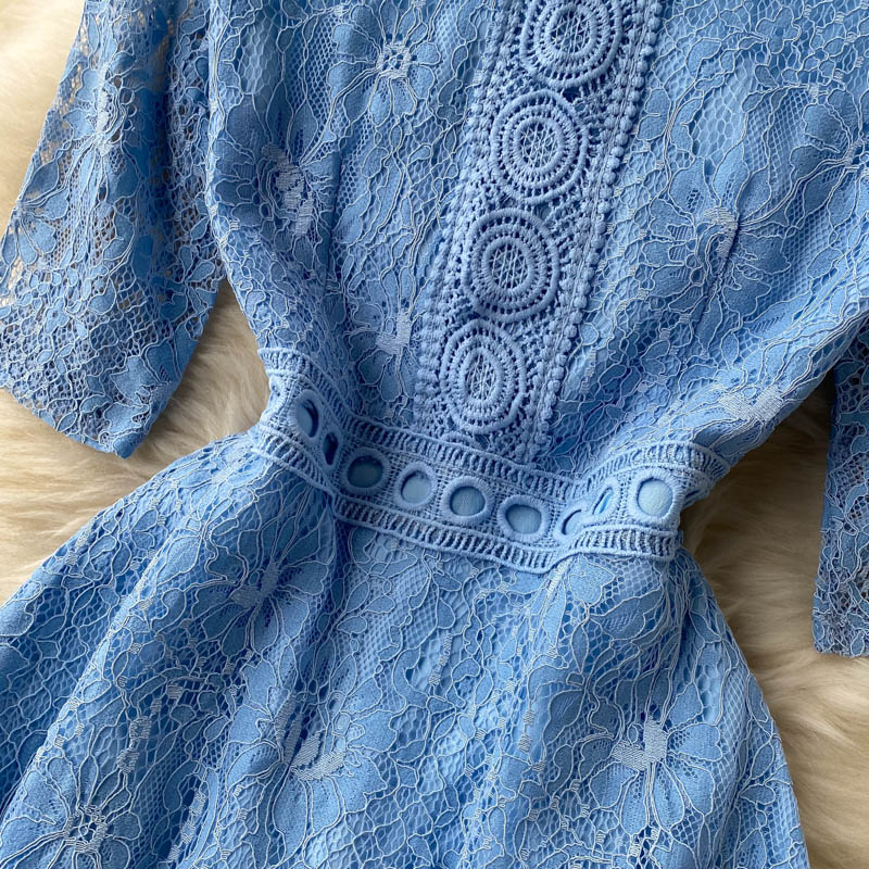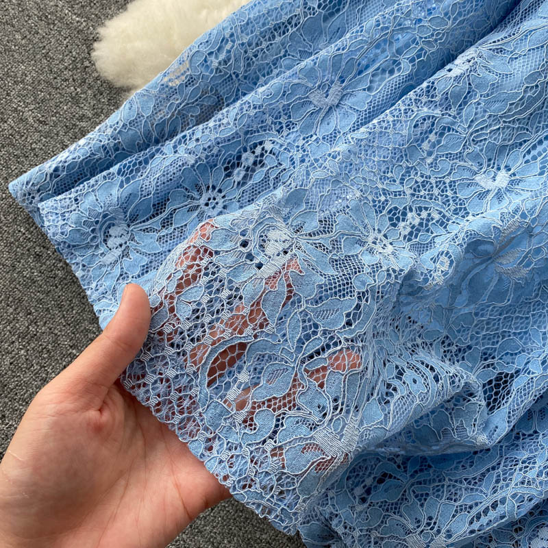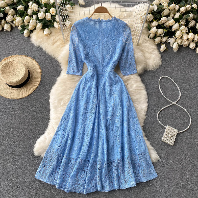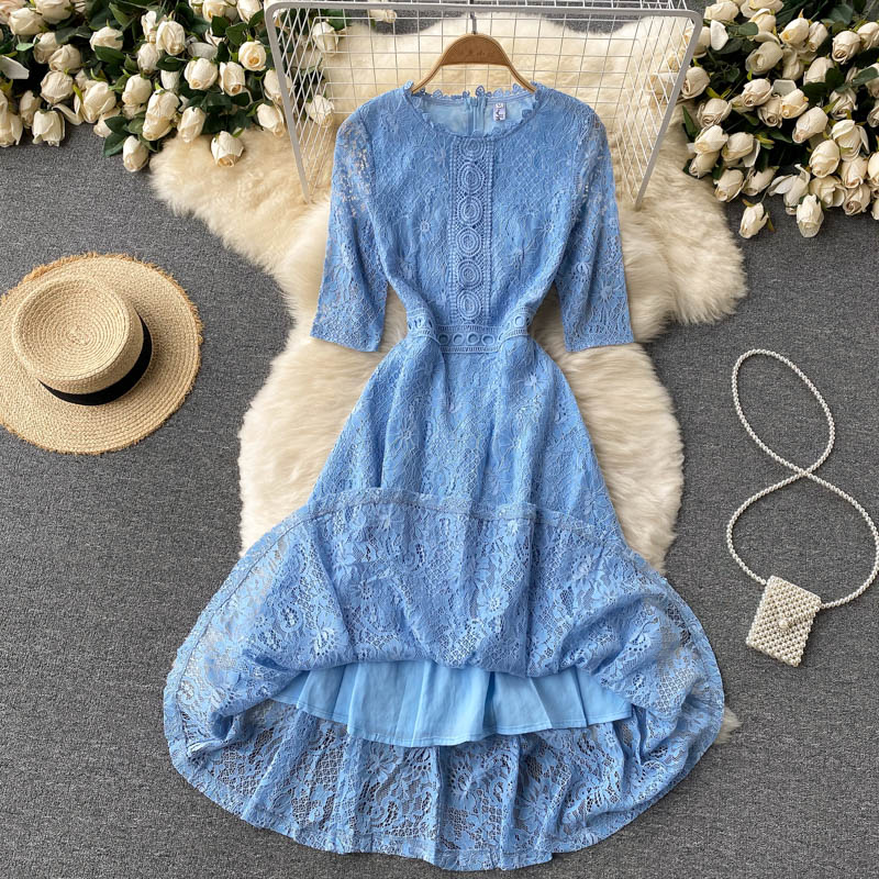 Summer Vintage Blue Lace Midi Dress Women O-Neck High Waist A-Line Casual Robe Female Elegant Slim Party Vestidos Fashion