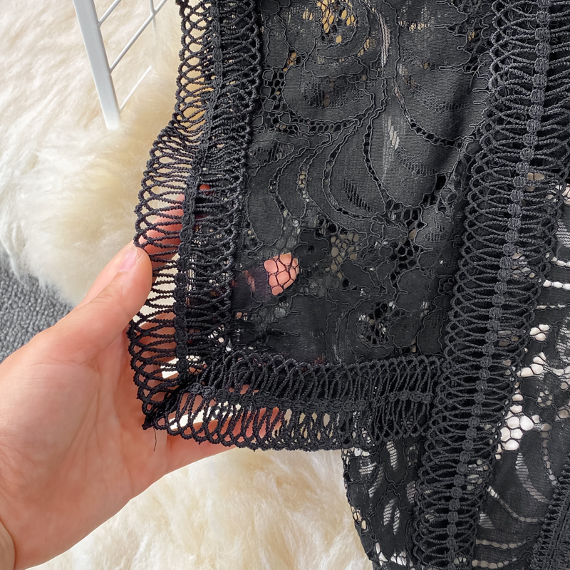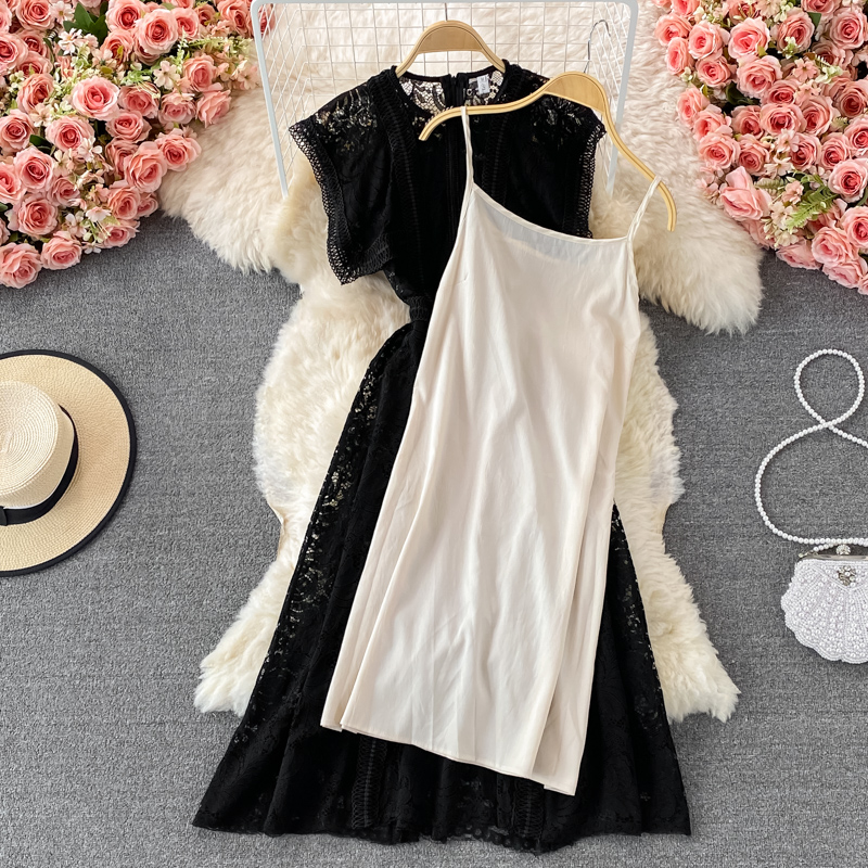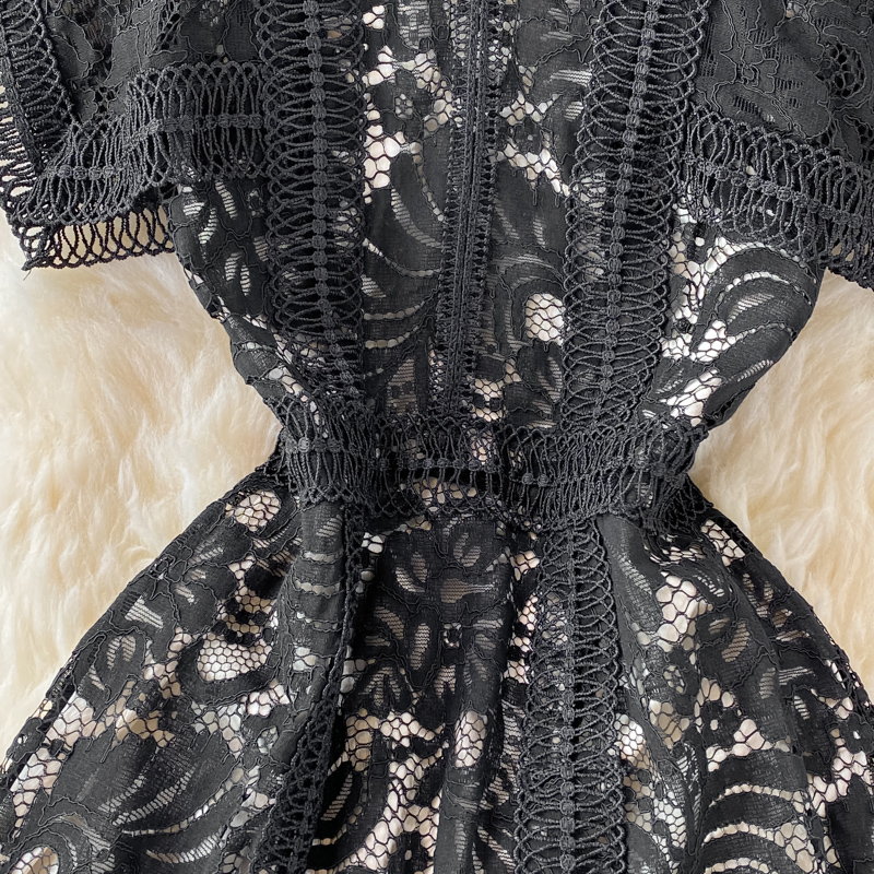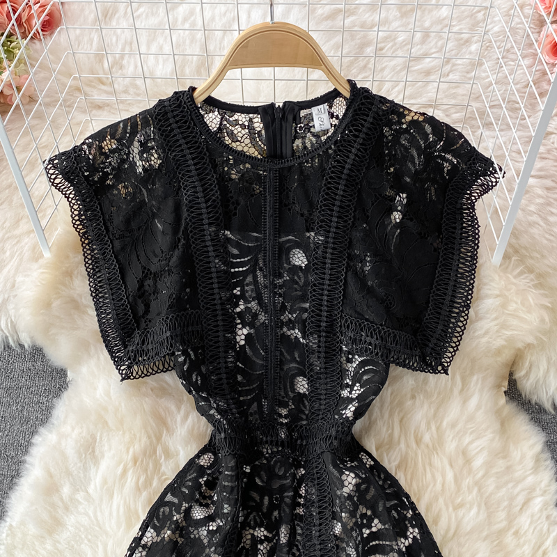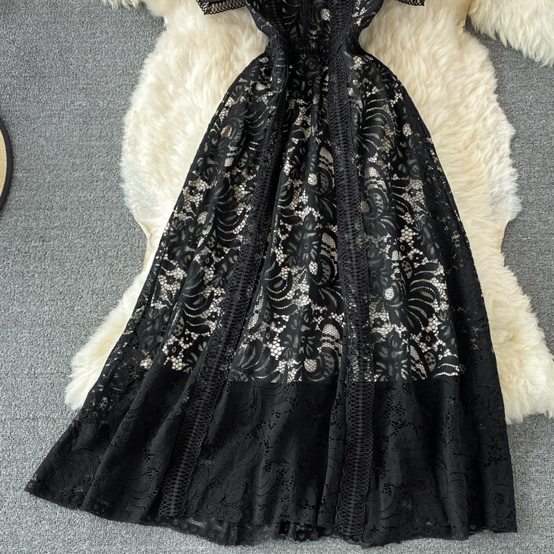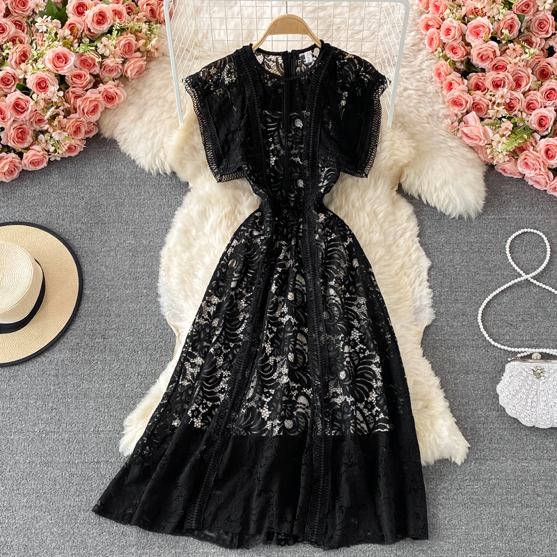 Summer Black Embroidered Lace Midi Dress Women Vintage O-Neck A-Line High Waist Vestidos Casual Female Robe Female New