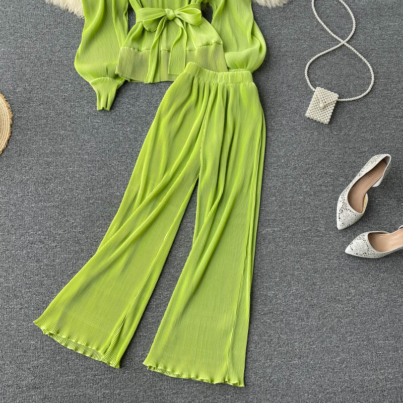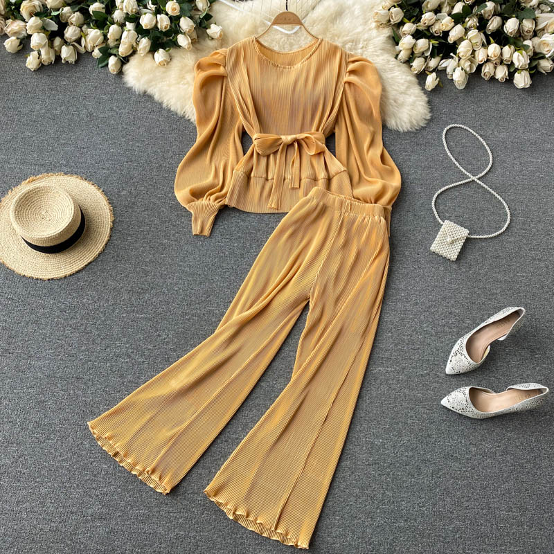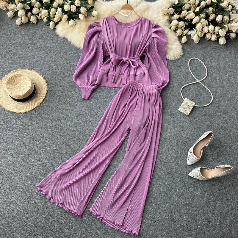 Cheap Pant Suits, Buy Quality Women’s Clothing Directly from China Suppliers:Purple/Green/Black Draped 2Pcs Set Women Spring Autumn Vintage O Neck Puff Sleeve Tops + High Waist Pleated Skirt Suits New