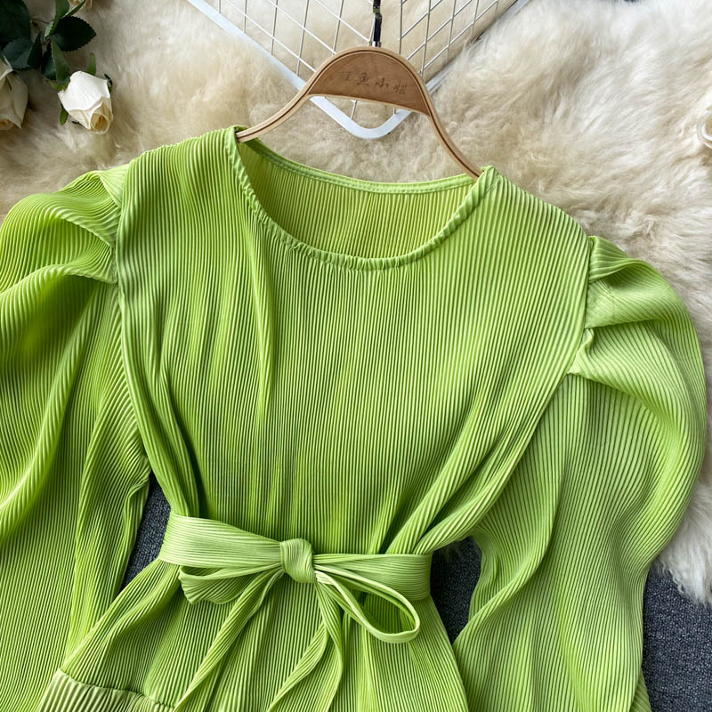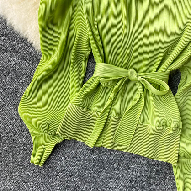 Purple/Green/Black Draped 2Pcs Set Women Spring Autumn Vintage O-Neck Puff Sleeve Tops + High Waist Pleated Skirt Suits New