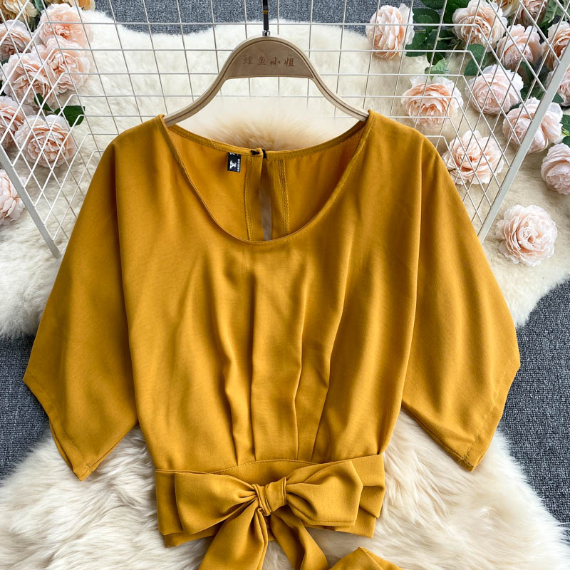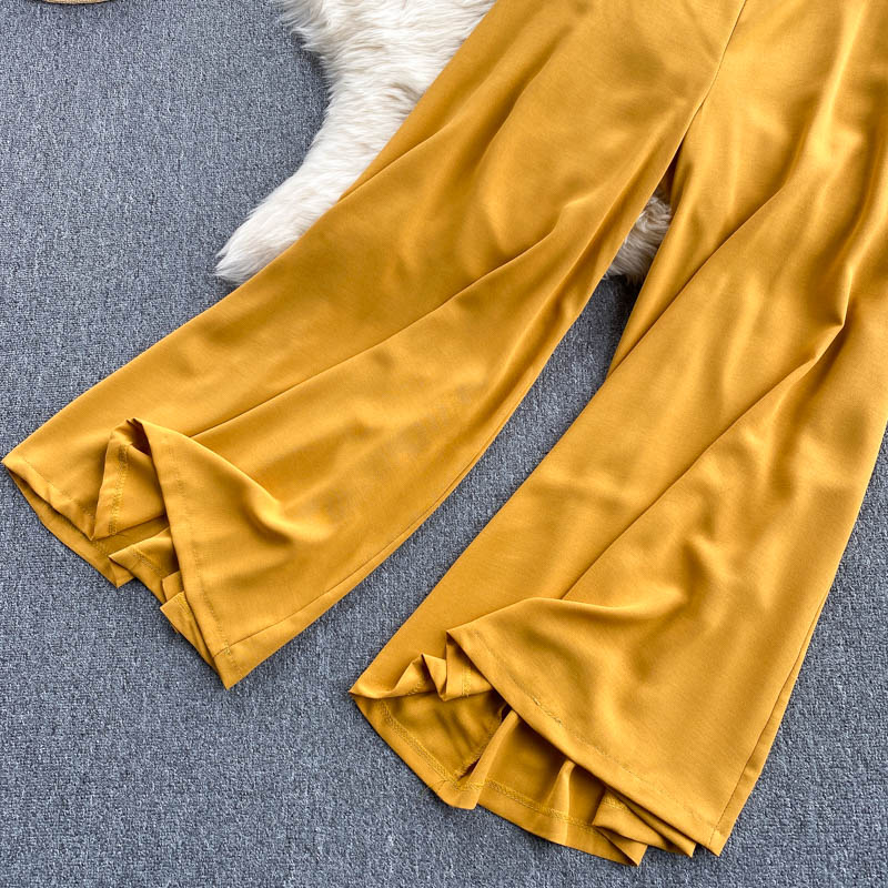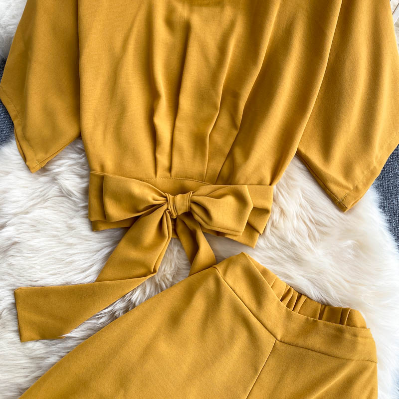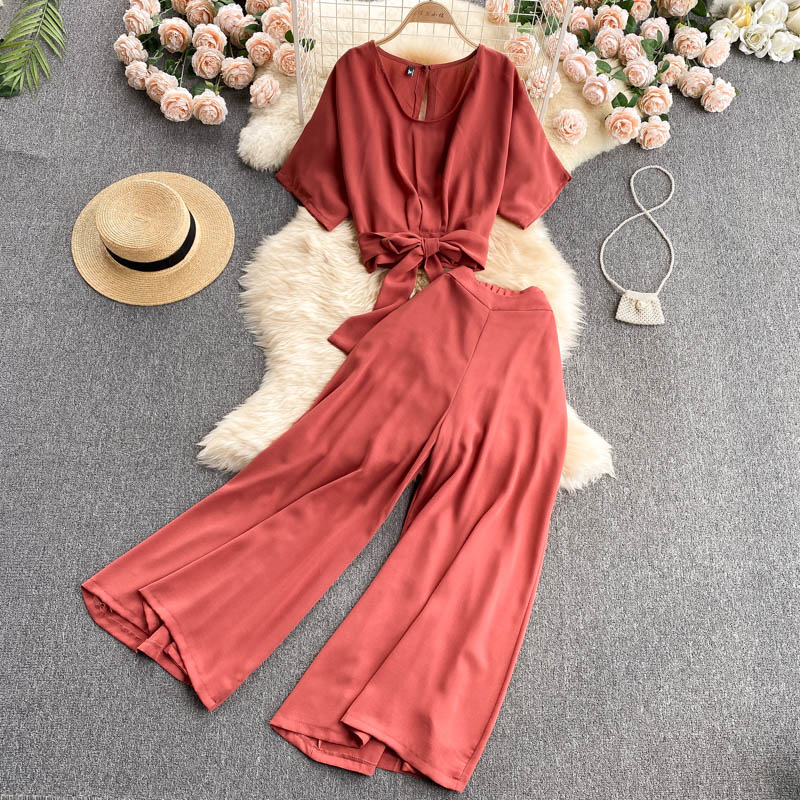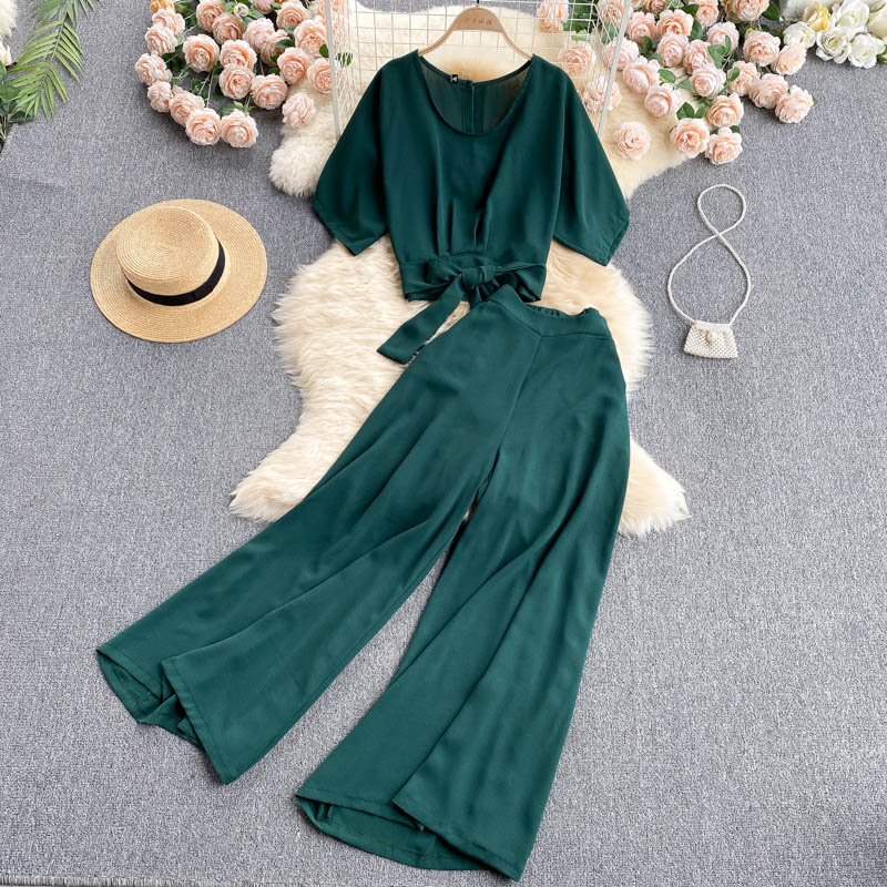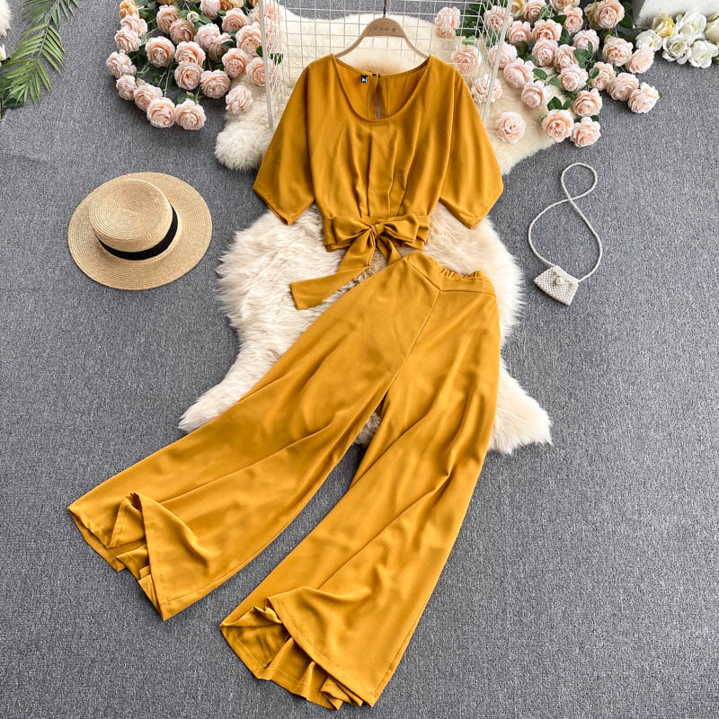 Cheap Pant Suits, Buy Quality Women’s Clothing Directly from China Suppliers:Yellow/Green/Red Two Piece Set Women Summer Elegant Round Neck Short Sleeve Tops + Wide Leg Pants Casual Bandage Suit New