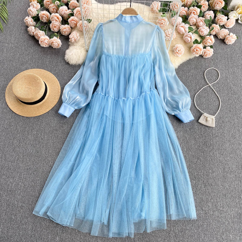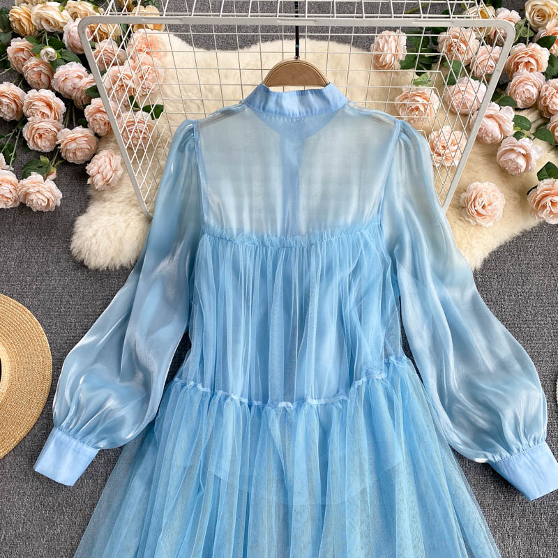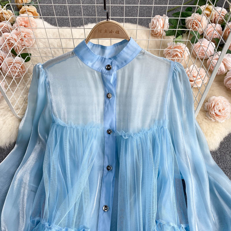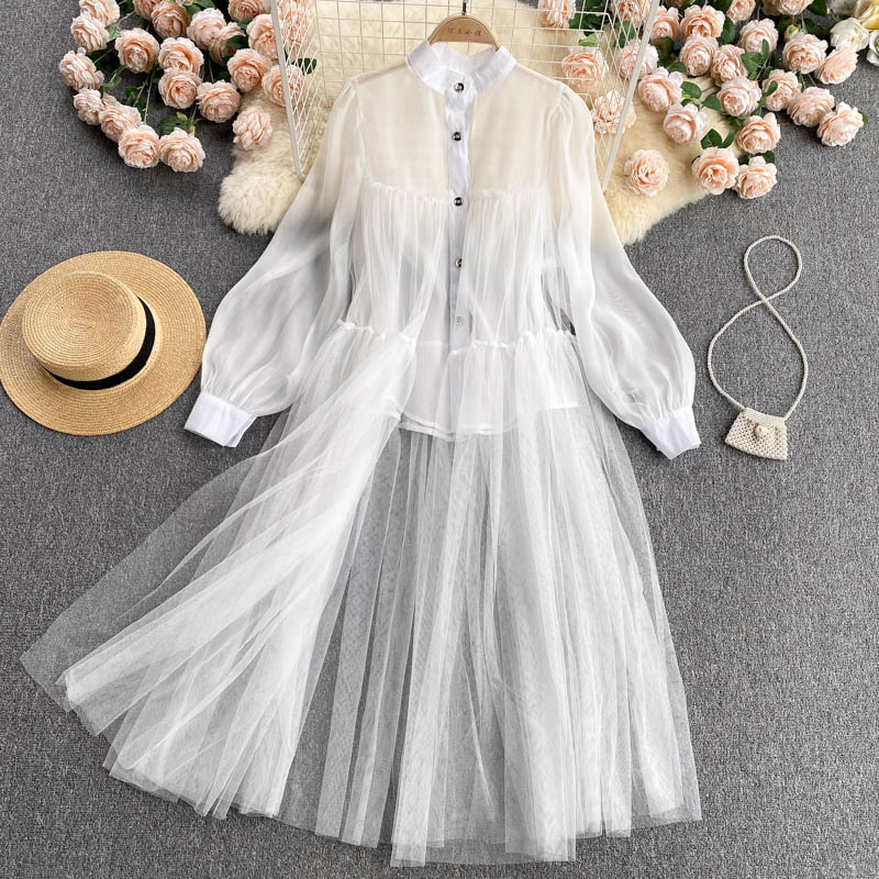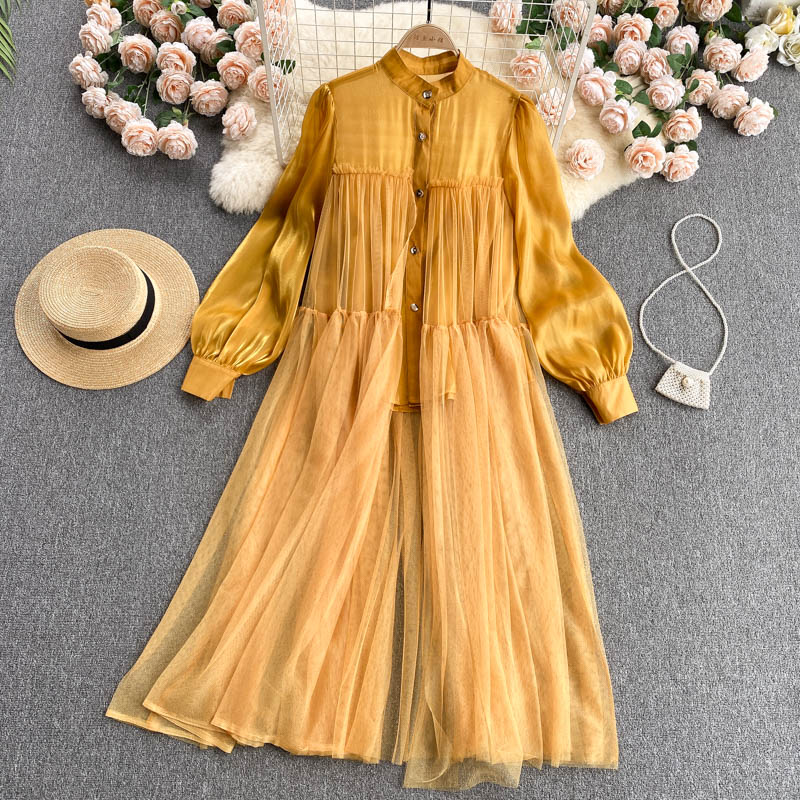 Yellow/Black/White Mesh Patchwork Chiffon Long Blouse Women Elegant Lantern Sleeve Loose Party Shirts Female Blusas New