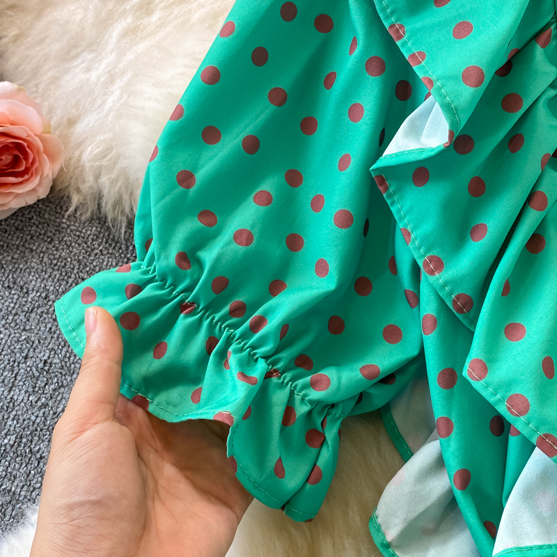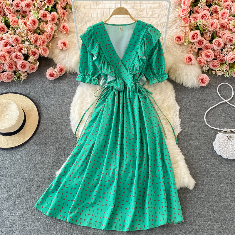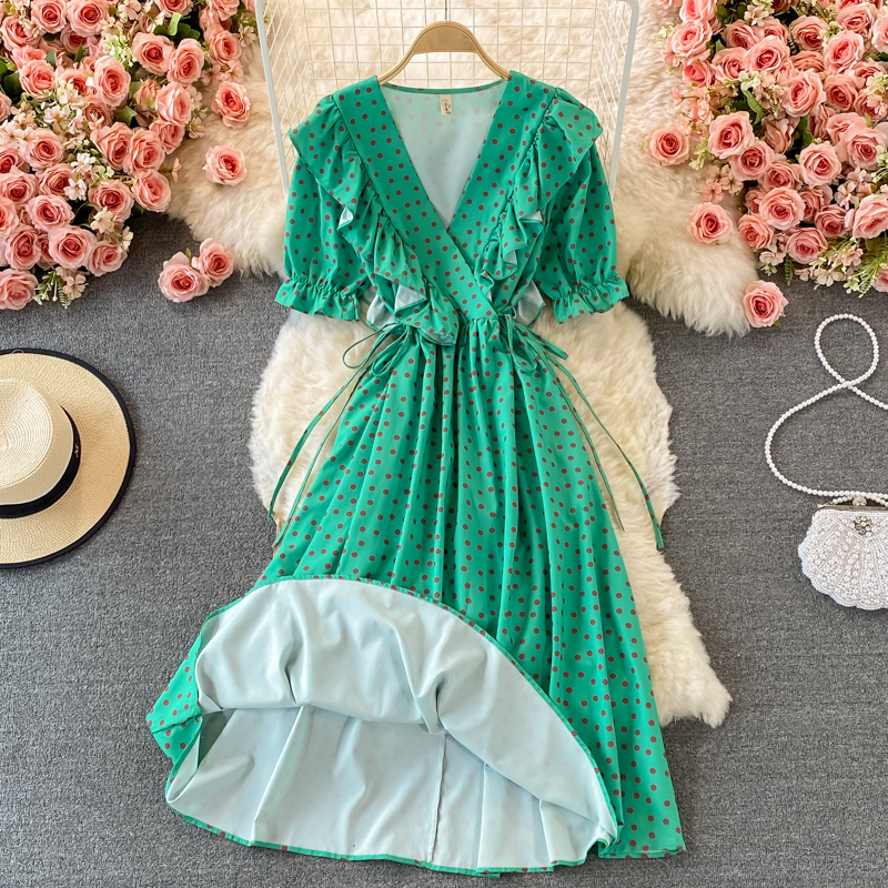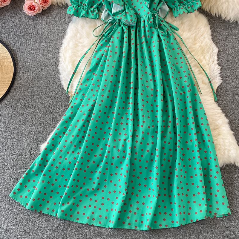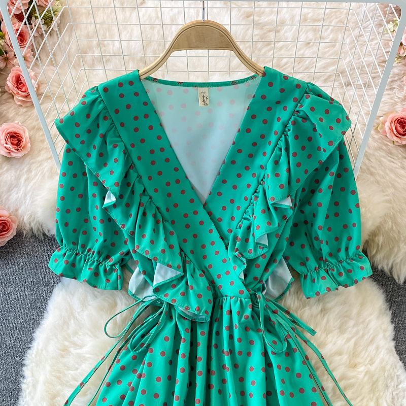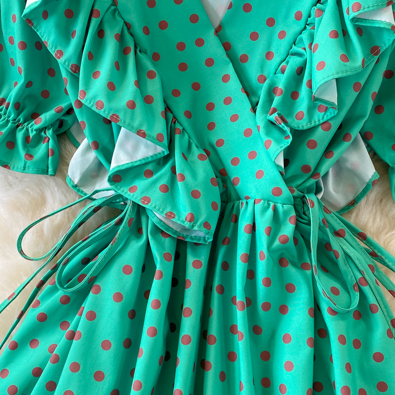 Summer Green Polka Dot Ruffle Midi Dress Women Sexy V-Neck Flare Short Sleeve High Waist Drawstring Big Swing Vestidos New