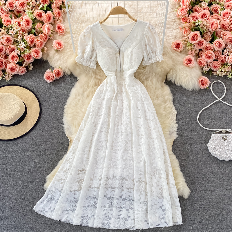 Cheap Dresses, Buy Quality Women’s Clothing Directly from China Suppliers:Vintage Black/White Lace Midi Dress Summer Sexy Zipper High Waist Short Puff Sleeve Hollow Out Casual Vestidos Female Robe
