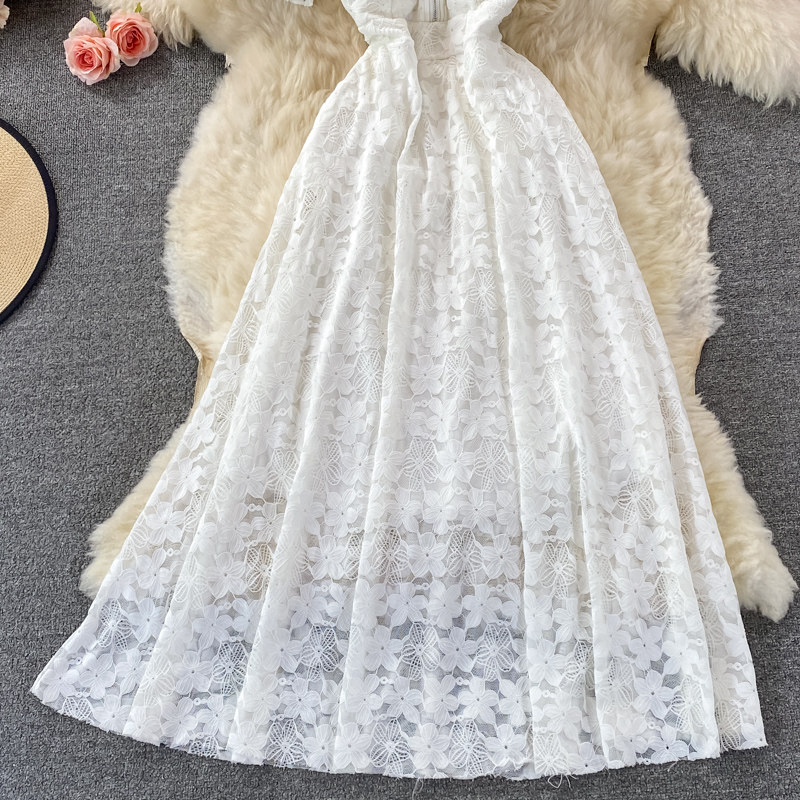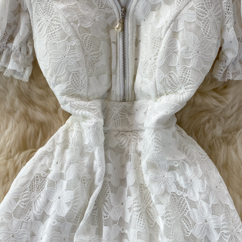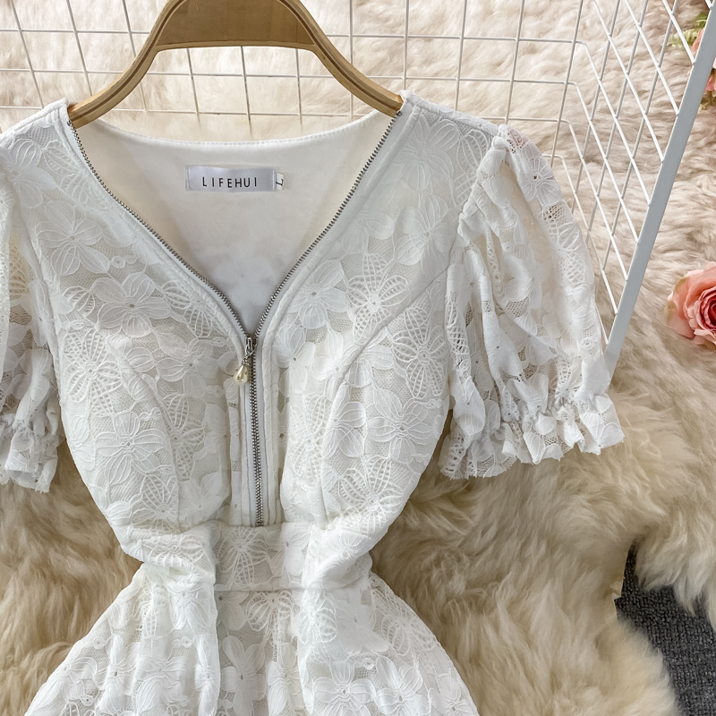 Vintage Black/White Lace Midi Dress Summer Sexy Zipper High Waist Short Puff Sleeve Hollow Out Casual Vestidos Female Robe