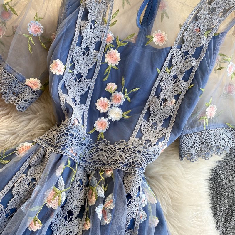 Sweet Blue Mesh Embroidered Dress For Women Summer Vacation Beach Party Vestidos Female Short Sleeve O-Neck Patchwork Robe