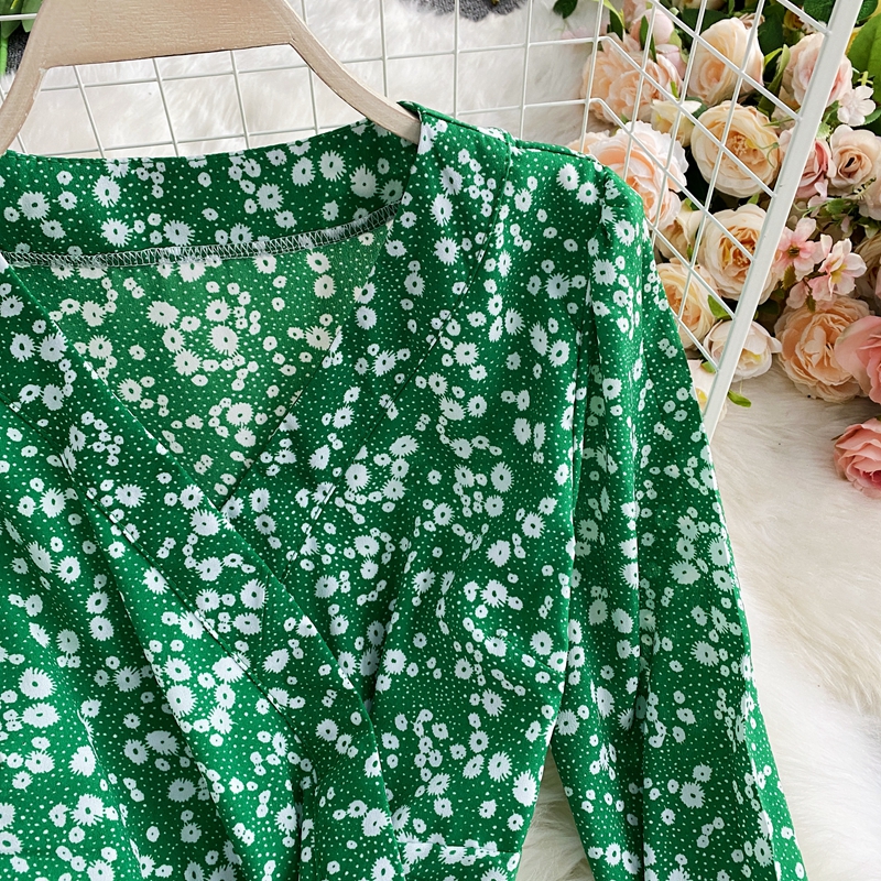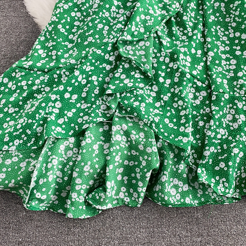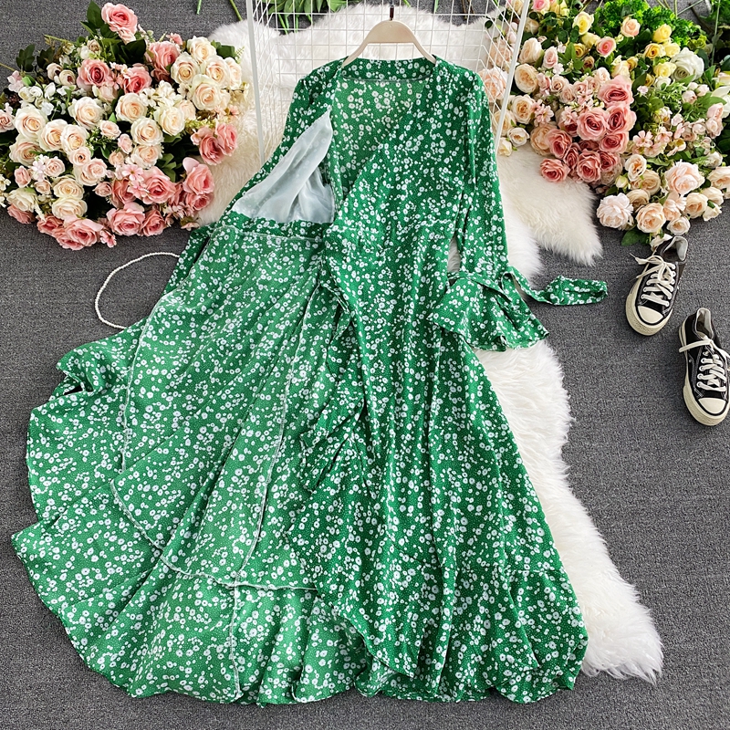 Spring Autumn Floral Irregular Ruffle Long Dress For Women Vintage V-Neck Flare Sleeve High Waist Slim Big Swing Maxi Robe