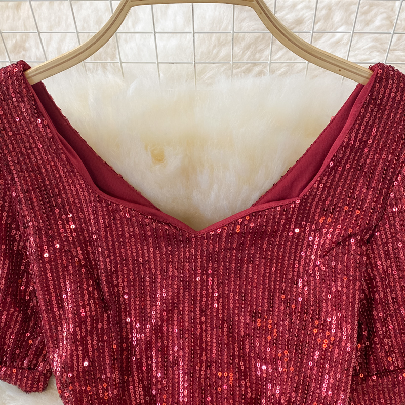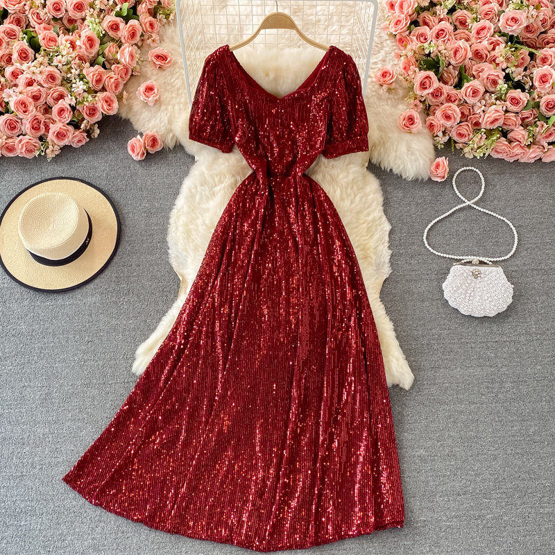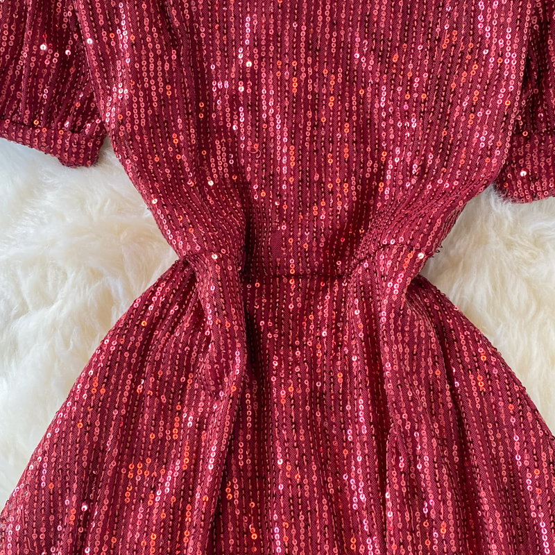 Sexy Sequins Party Long Dress Women Elegant Short Sleeve V-Neck High Waist A-Line Club Maxi Robe Female Red/Black/Beige Vestidos