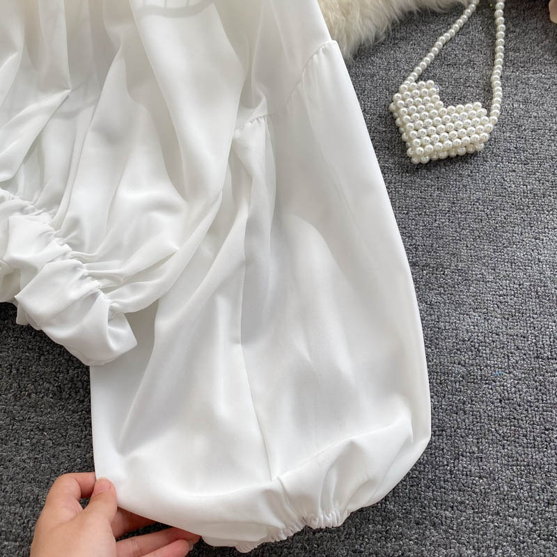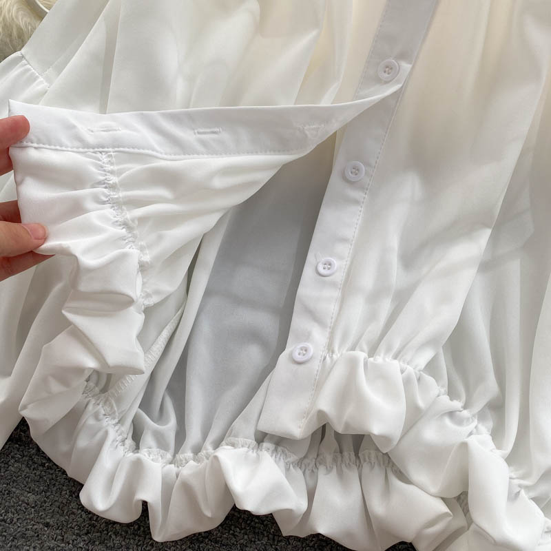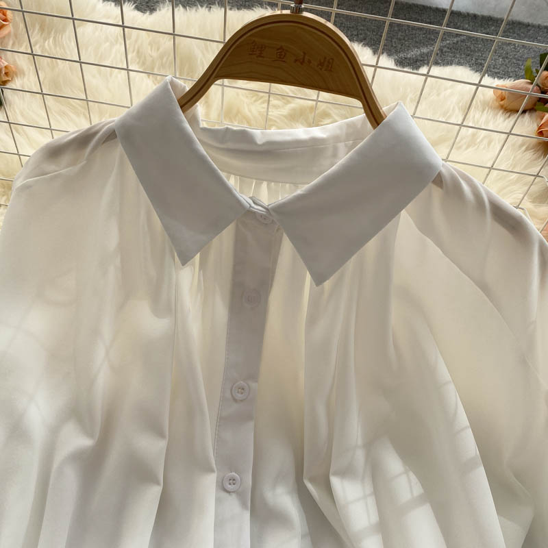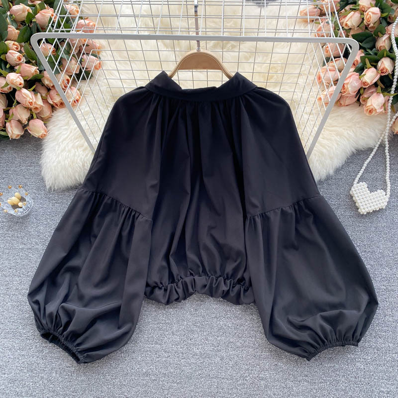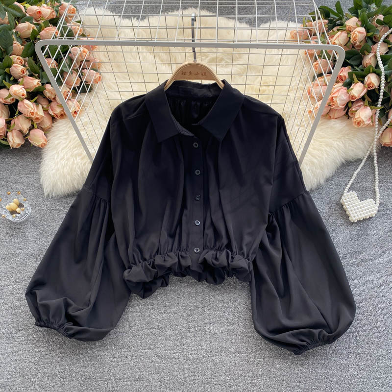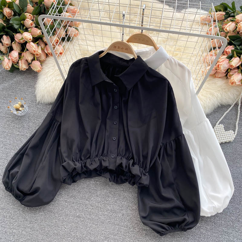 Vintage Black/White Short Blouse Women Summer Casual Turn-Down Collar Puff Long Sleeve Single Breasted Tops Female Shirts
