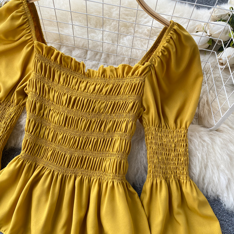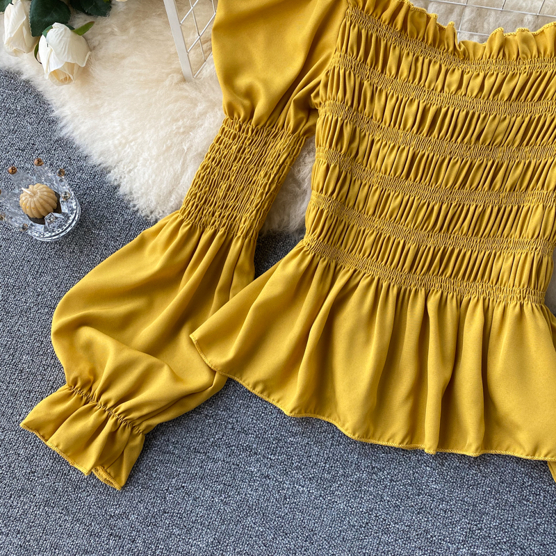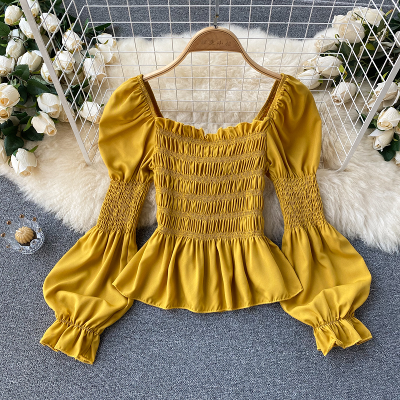 Casual Square Collar Puff Long Sleeve Short Blouse For Women Spring Autumn Red/Yellow/White Draped Shirt Female Blusas New