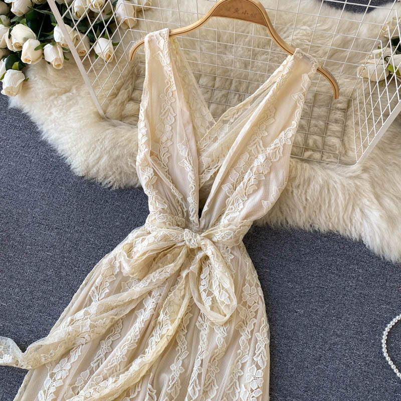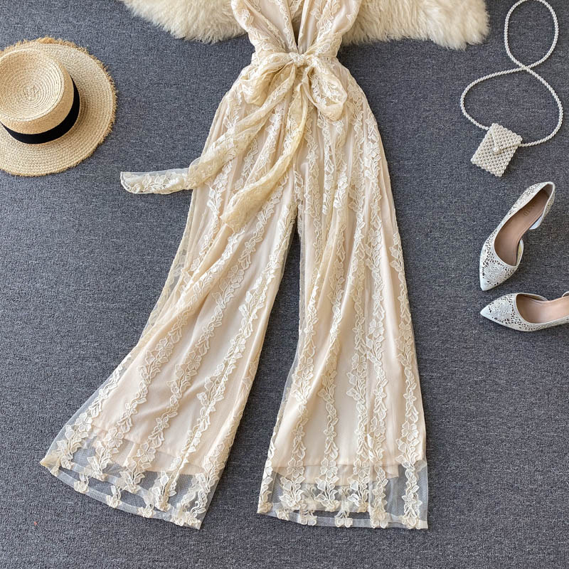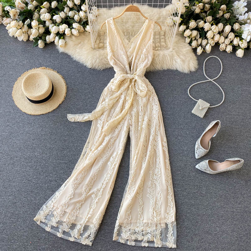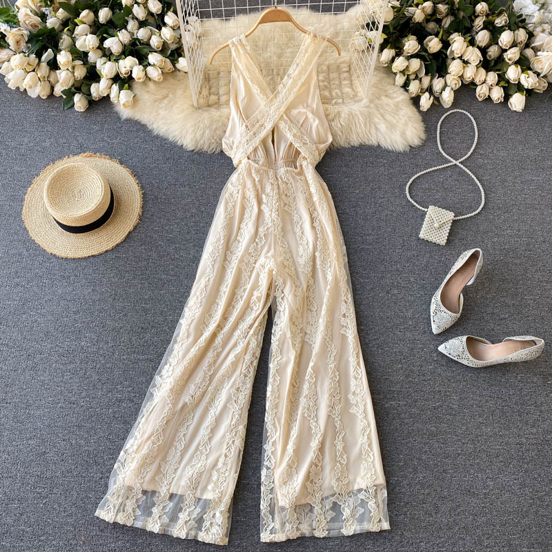 Sexy Beige Hollow Out Embroidered Romper Women Summer Deep V-Neck Sleeveless Open Back Slim Wide Leg Jumpsuits Female New