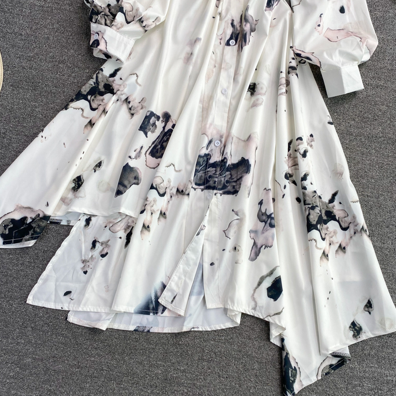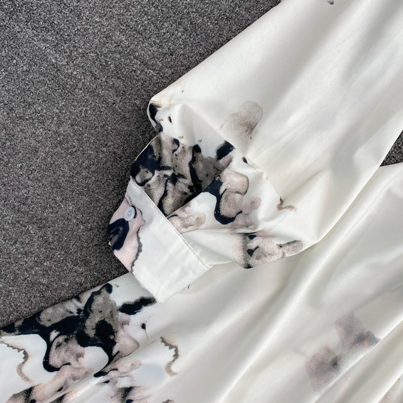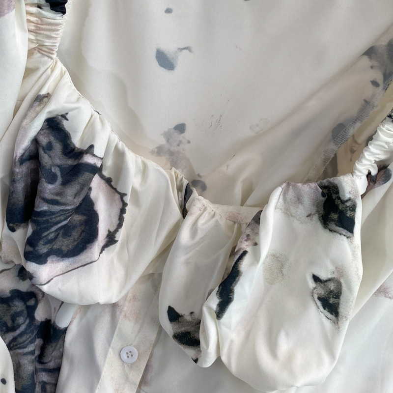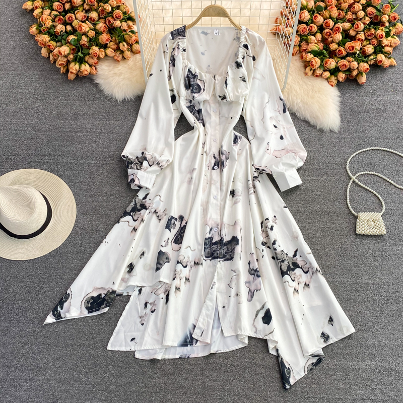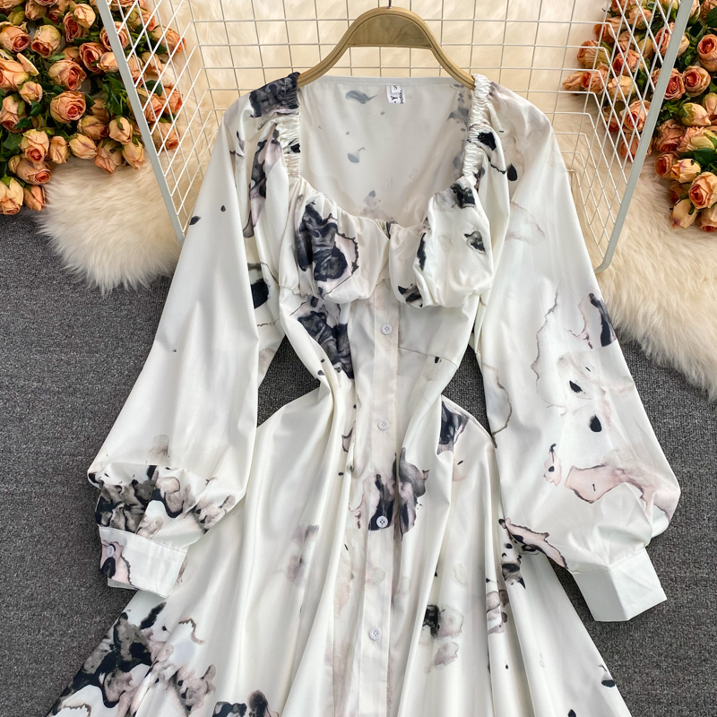 Sexy White Irregular Printed Long Dress Autumn Lantern Sleeve Square Collar High Waist Ink Pattern Vestidos Lady Maxi Robe