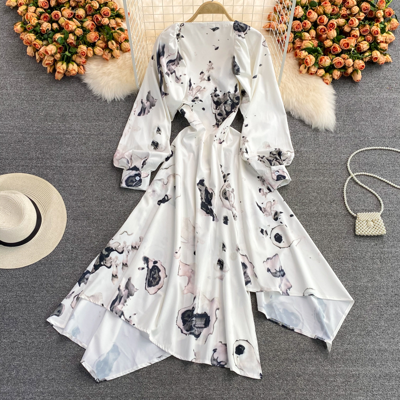 Cheap Dresses, Buy Quality Women’s Clothing Directly from China Suppliers:Sexy White Irregular Printed Long Dress Autumn Lantern Sleeve Square Collar High Waist Ink Pattern Vestidos Lady Maxi Robe