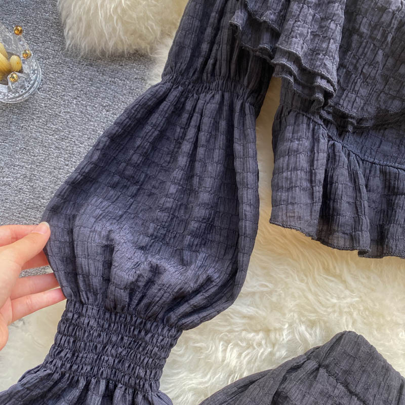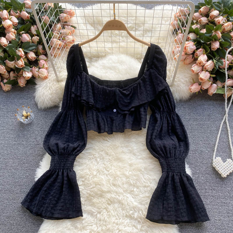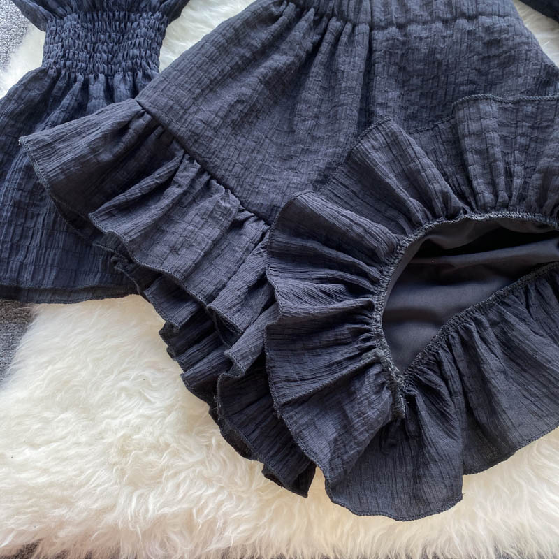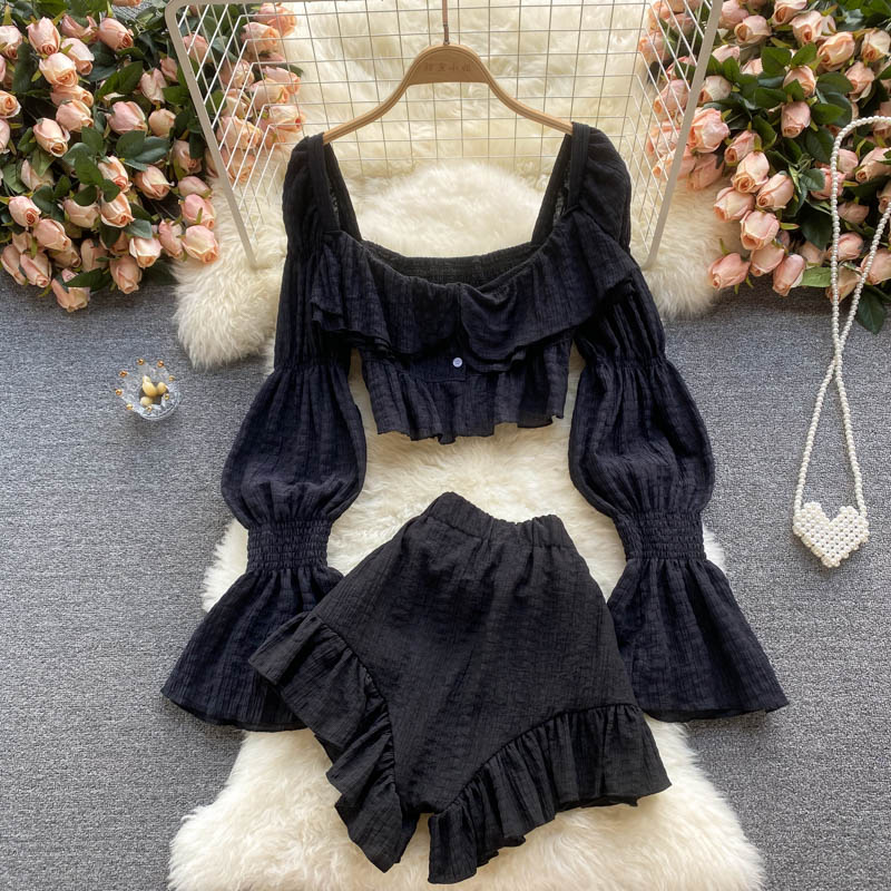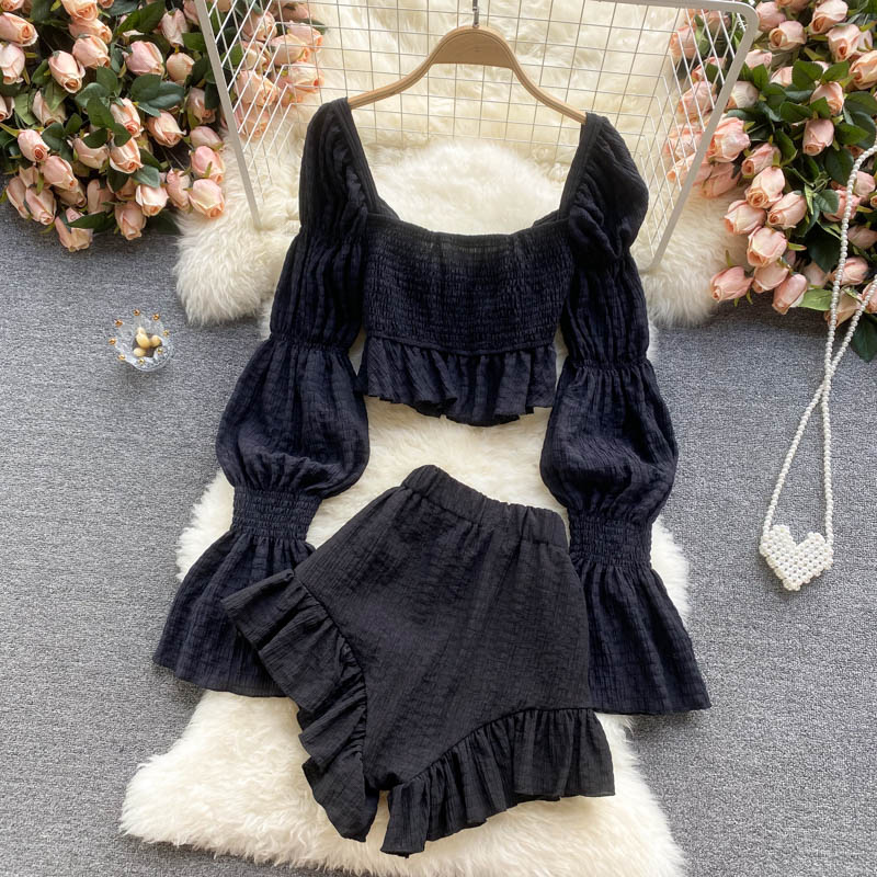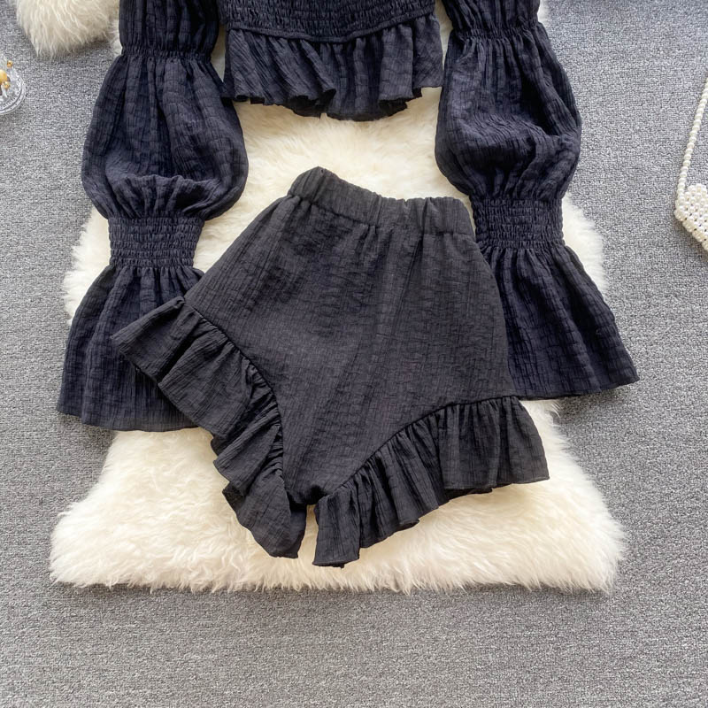 Sexy Women 2Pcs Set Black Square Collar Flare Long Sleeve Short Tops + Ruffle Shorts Female Club Party Two Piece Suit New
