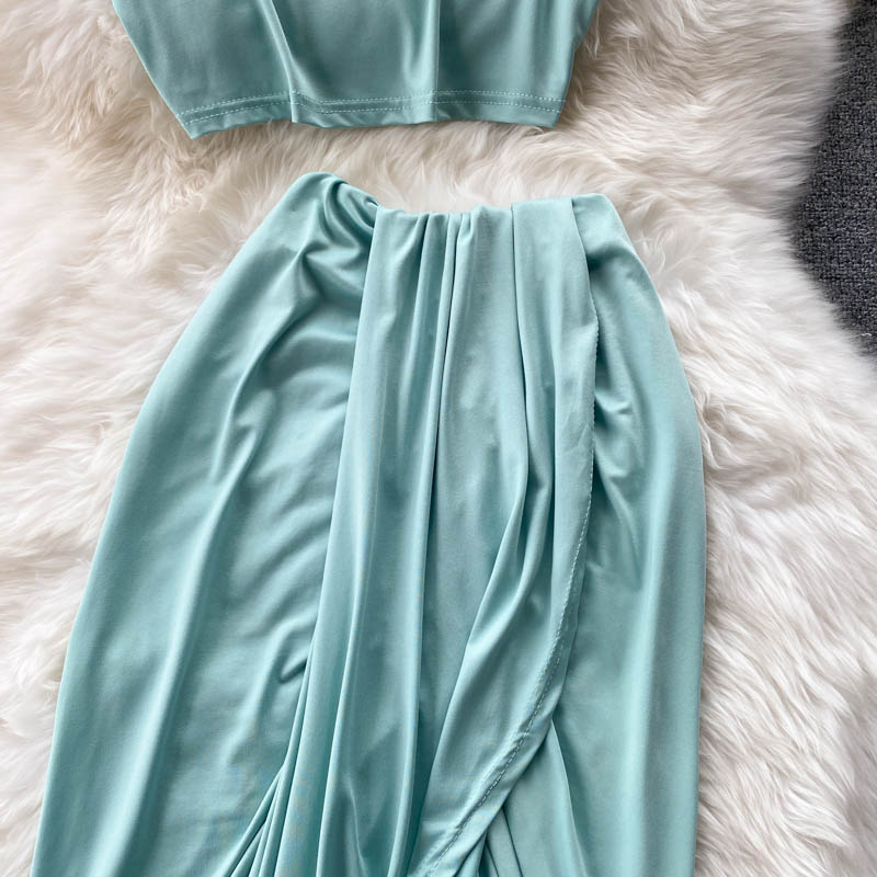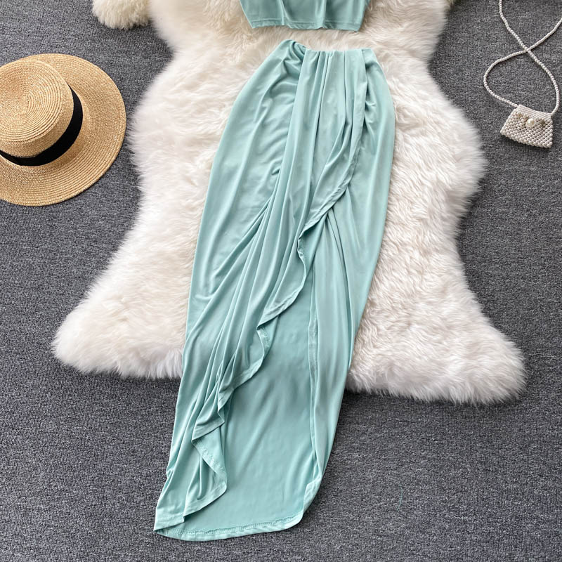 Summer Sexy 2Pcs Set For Women Green O-Neck Sleeveless Short Camis + High Waist Draped Irregular Long Skirt Female Casual Suit