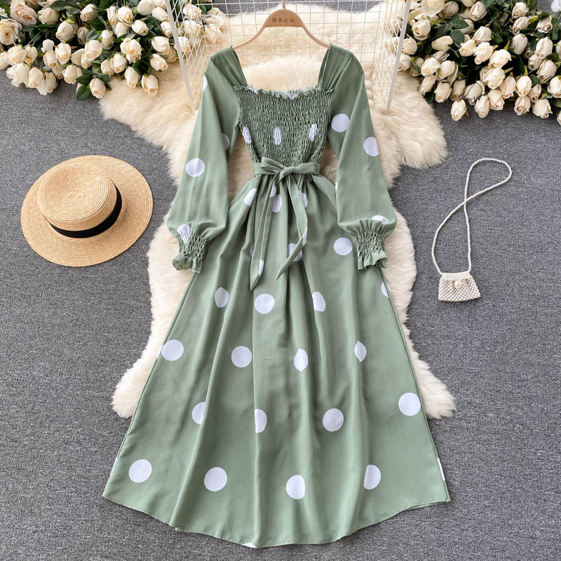Cheap Dresses, Buy Quality Women’s Clothing Directly from China Suppliers:Blue/Red/Yellow Polka Dot Midi Dress For Women Autumn Square Collar Lantern Long Sleeve High Waist Vestidos Vacation Party Robe