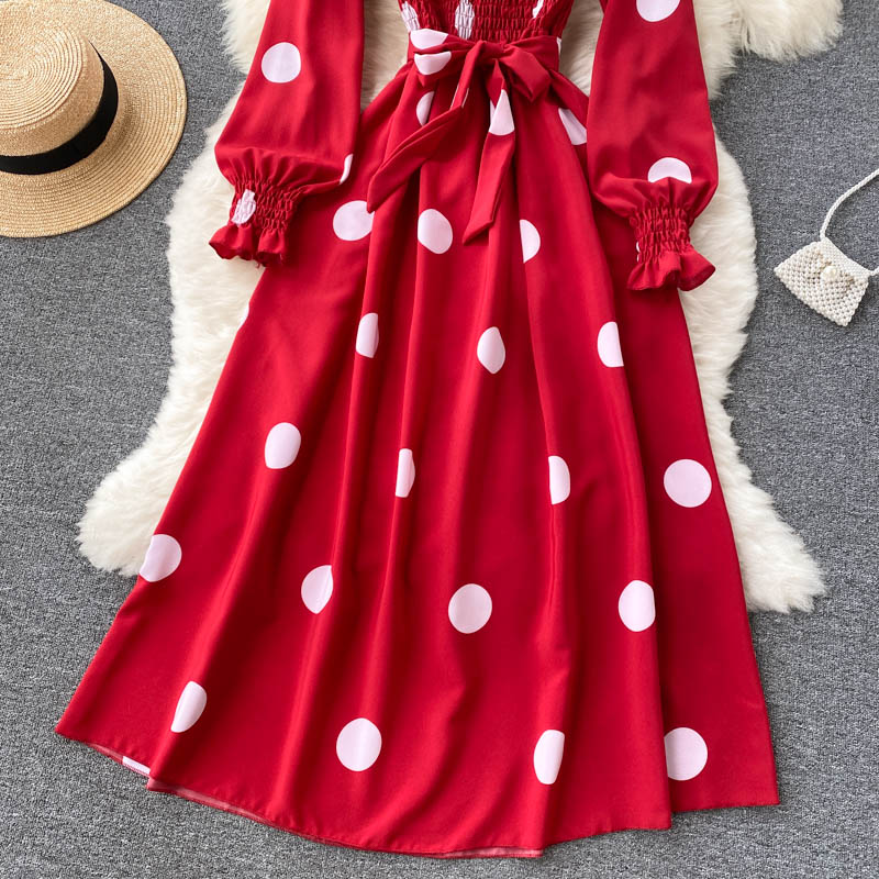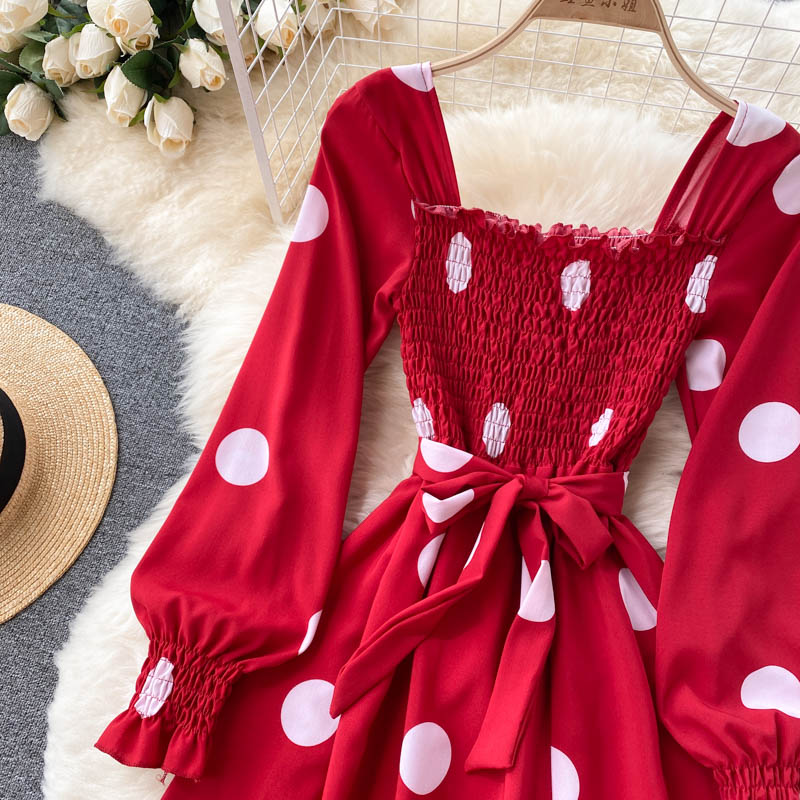 Blue/Red/Yellow Polka Dot Midi Dress For Women Autumn Square Collar Lantern Long Sleeve High Waist Vestidos Vacation Party Robe