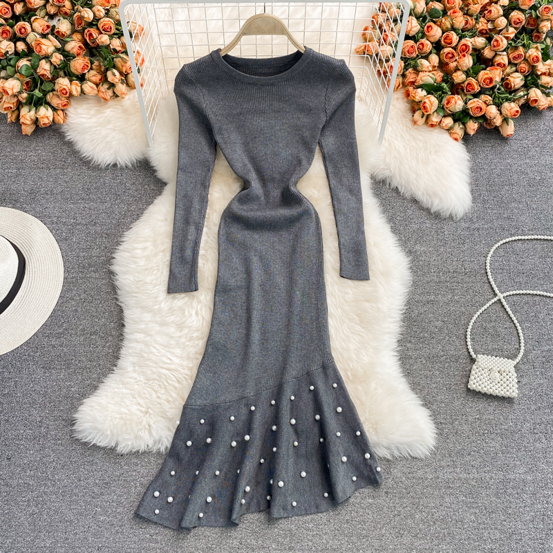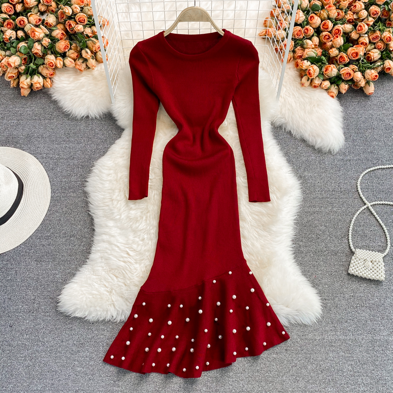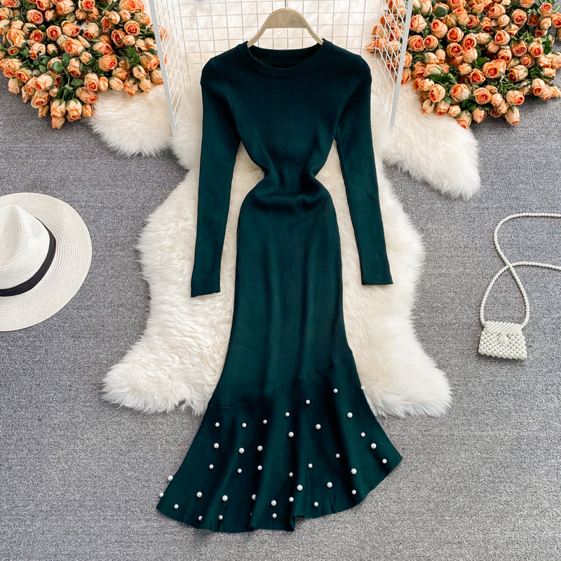 Cheap Dresses, Buy Quality Women’s Clothing Directly from China Suppliers:Green/Red Beading Knitted Bodycon Dress Women Autumn Winter Round Neck Long Sleeve Casual Mermaid Robe Female Vestidos New