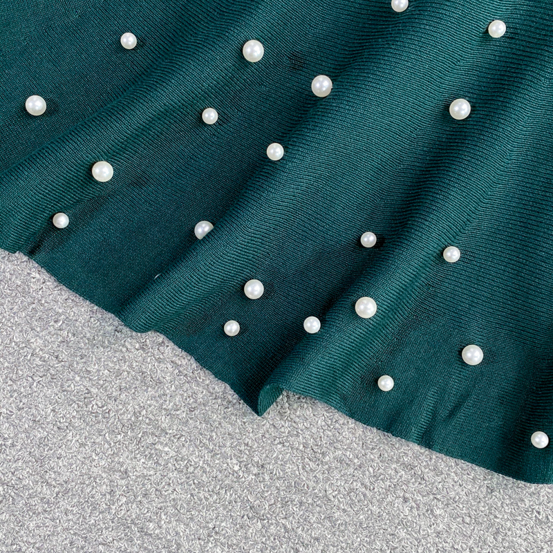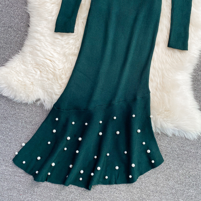 Green/Red Beading Knitted Bodycon Dress Women Autumn Winter Round Neck Long Sleeve Casual Mermaid Robe Female Vestidos New