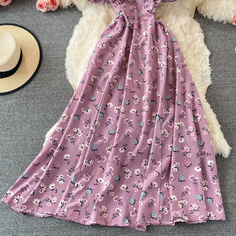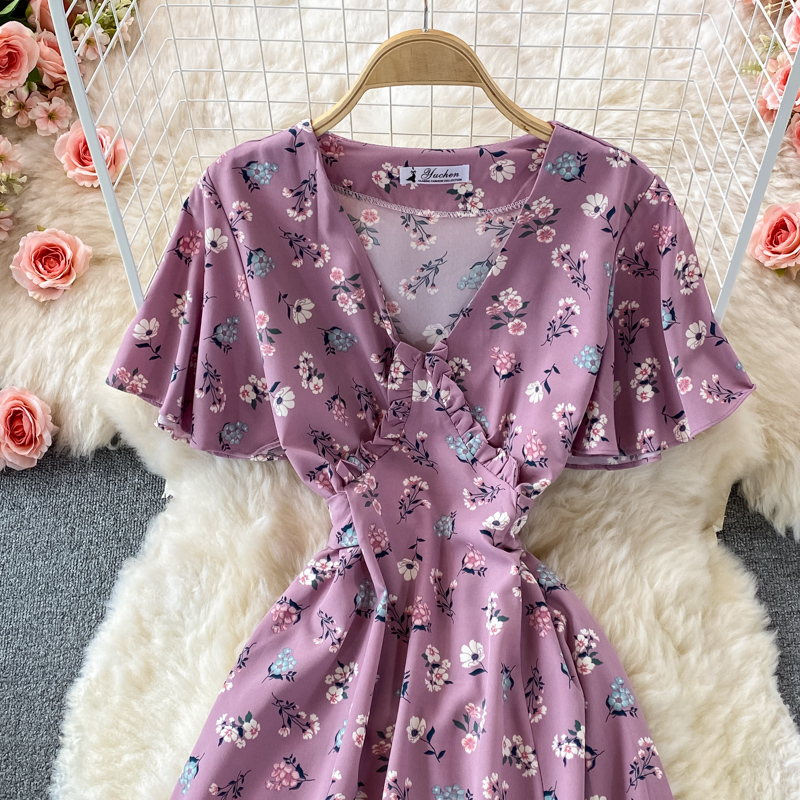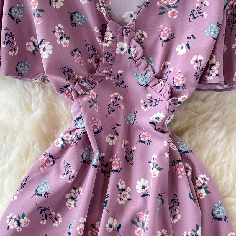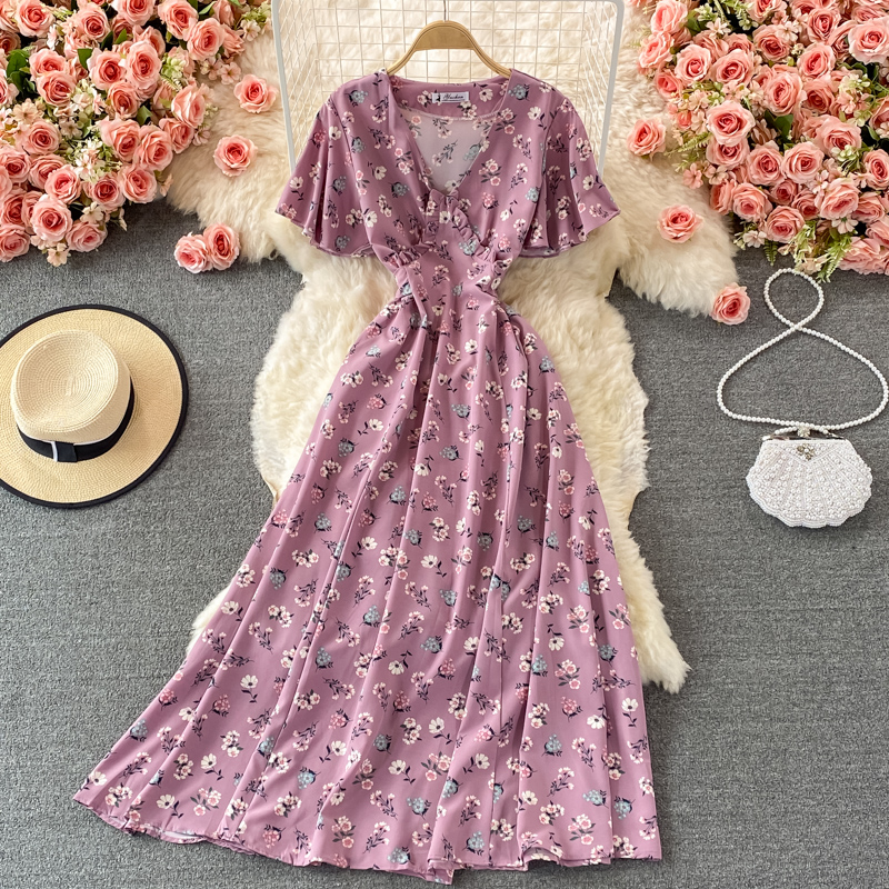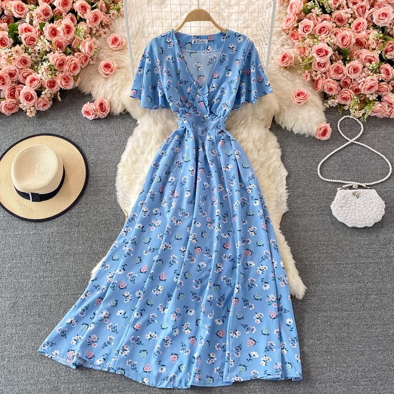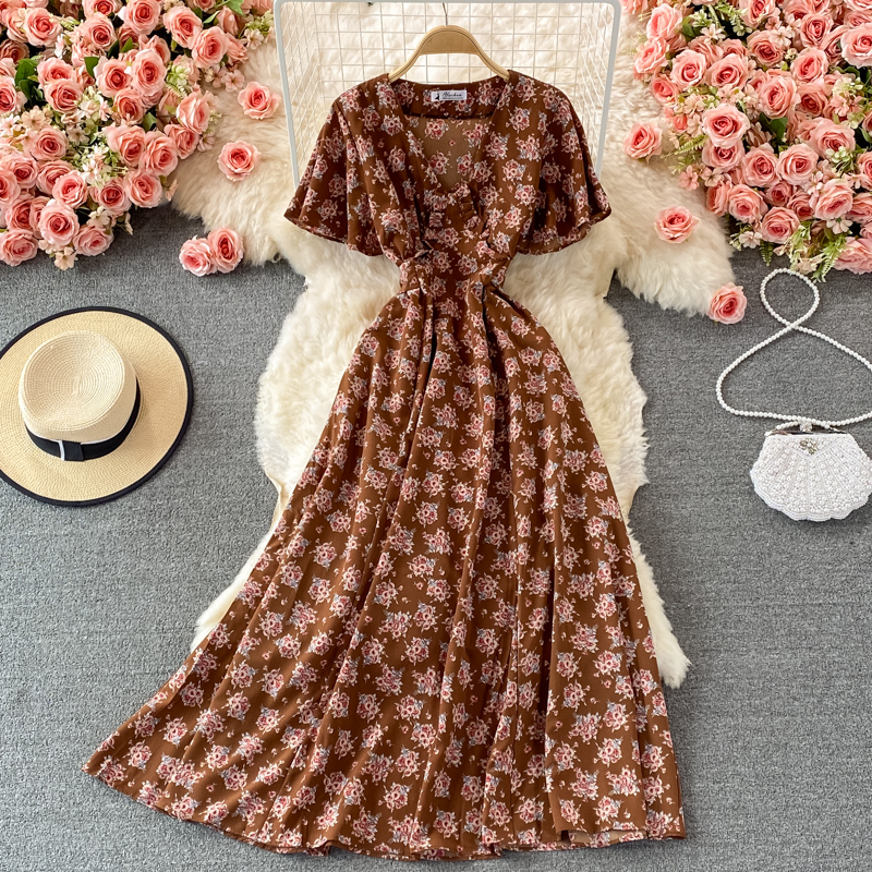 Vintage Women Floral Long Dress Sexy V-Neck Short Sleeve High Waist Big Swing Casual Vestidos Summer Female Robe New Robe