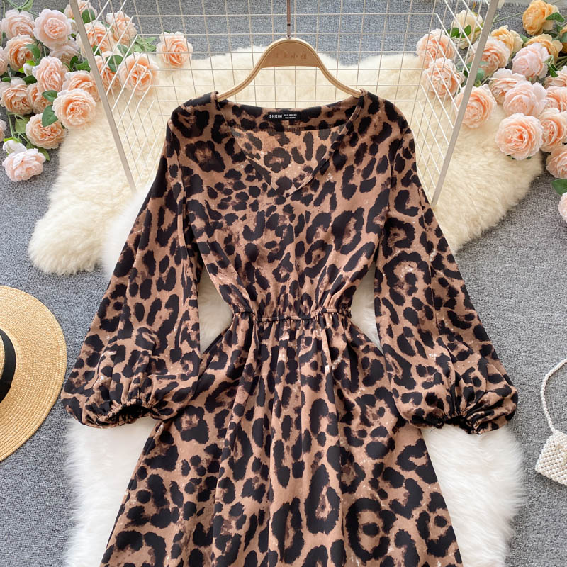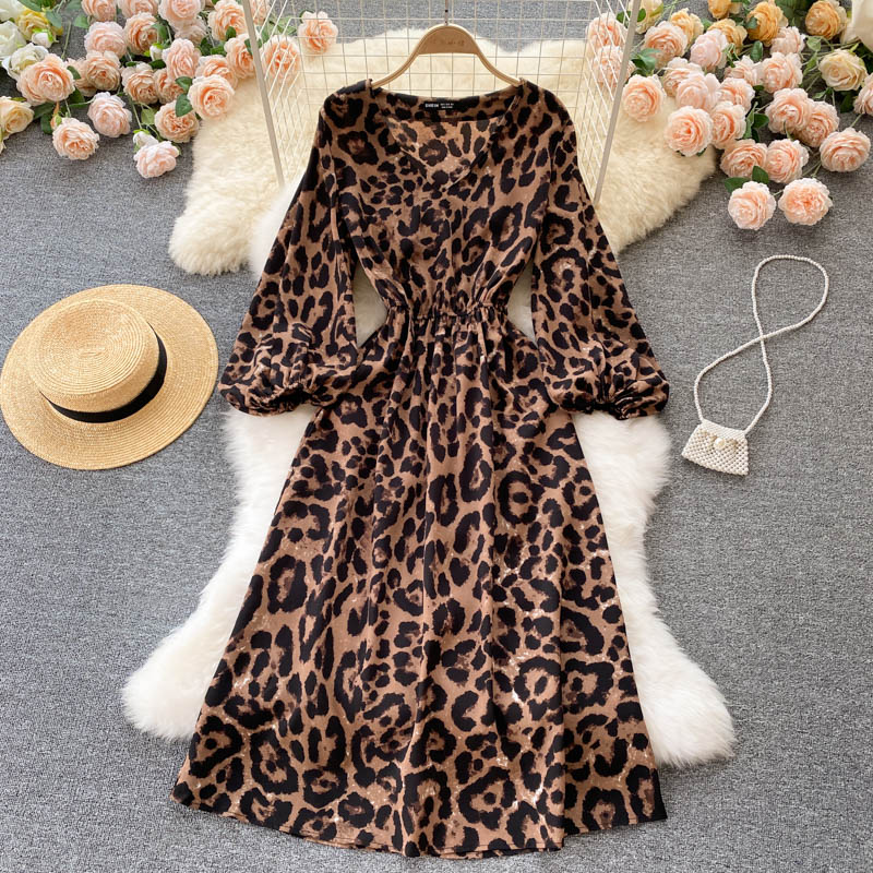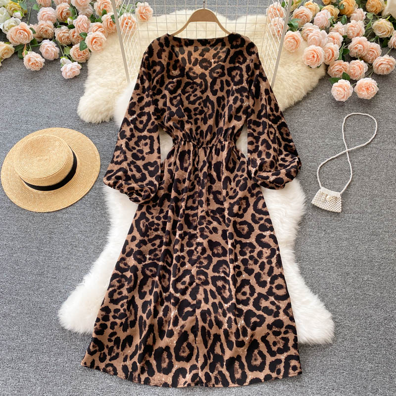 Cheap Dresses, Buy Quality Women’s Clothing Directly from China Suppliers:Vintage Women Leopard Dress Spring Autumn V Neck Puff Long Sleeve A Line Casual Vestidos Female Elegant Party Robe Fashion