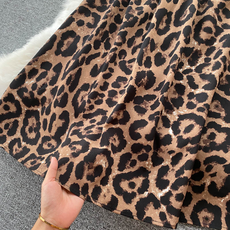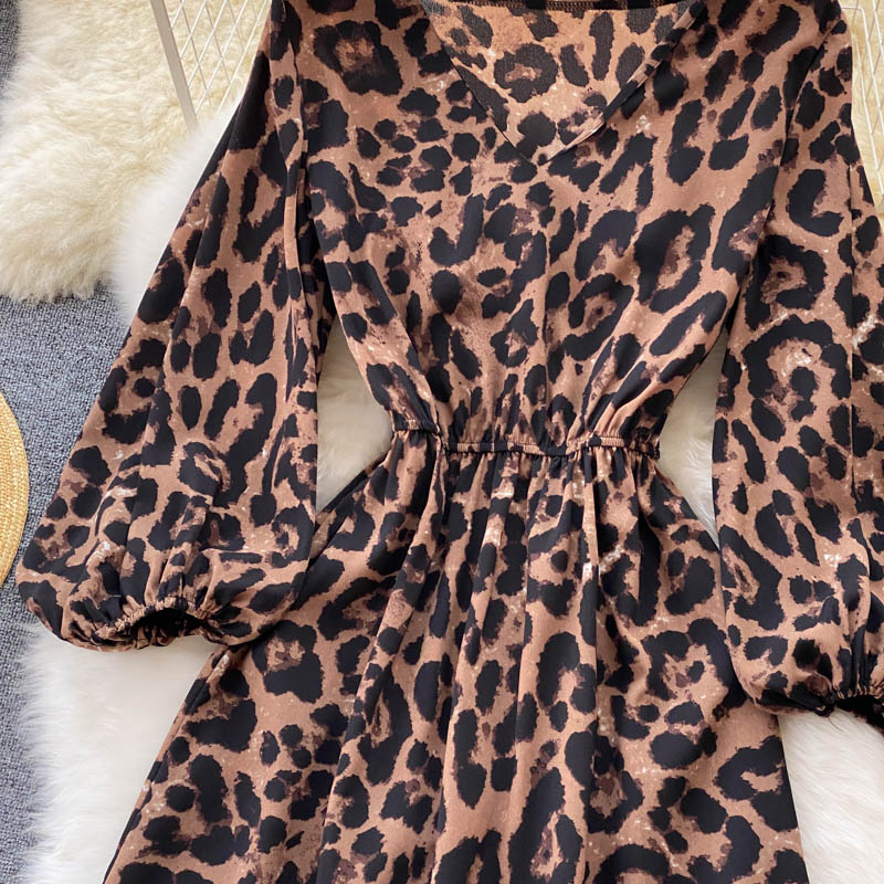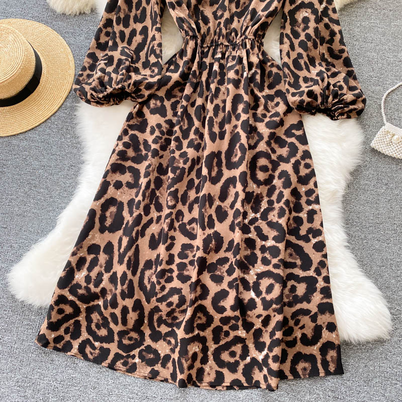 Vintage Women Leopard Dress Spring Autumn V-Neck Puff Long Sleeve A-Line Casual Vestidos Female Elegant Party Robe Fashion