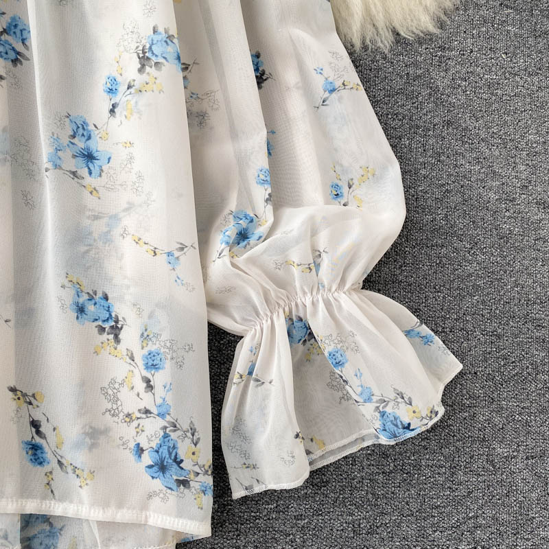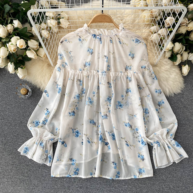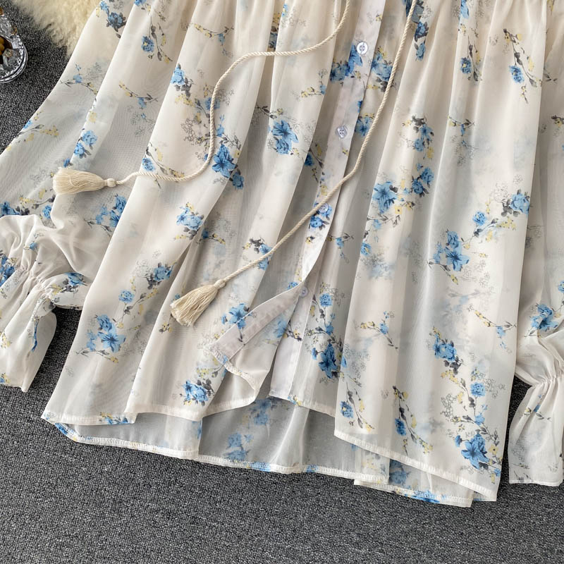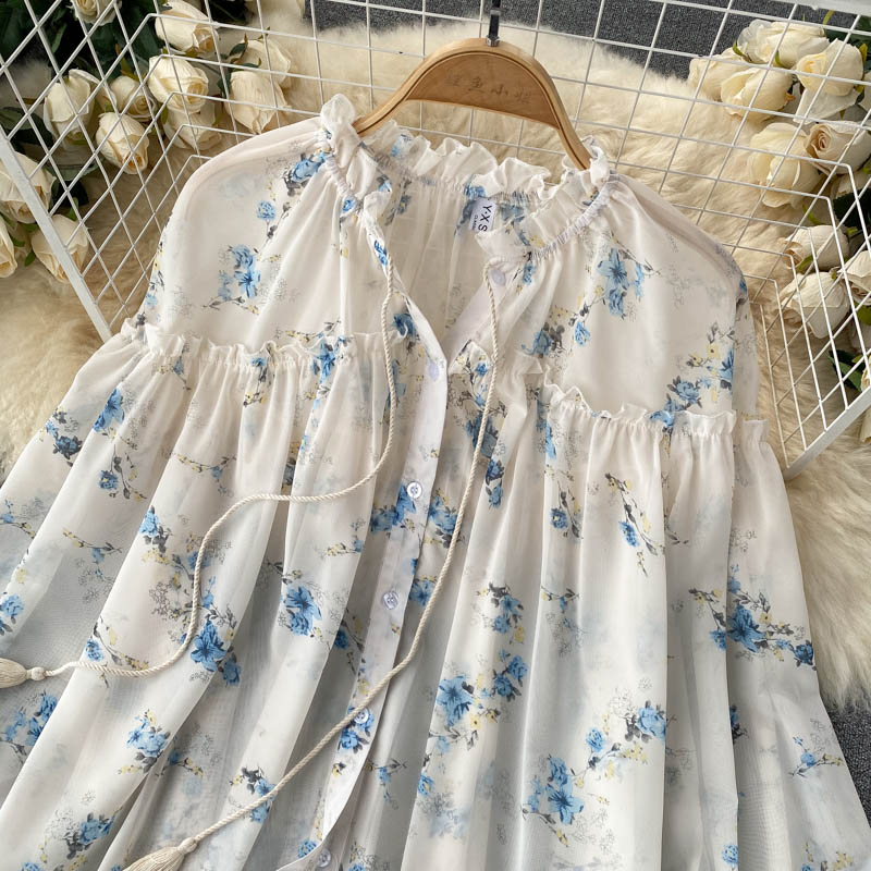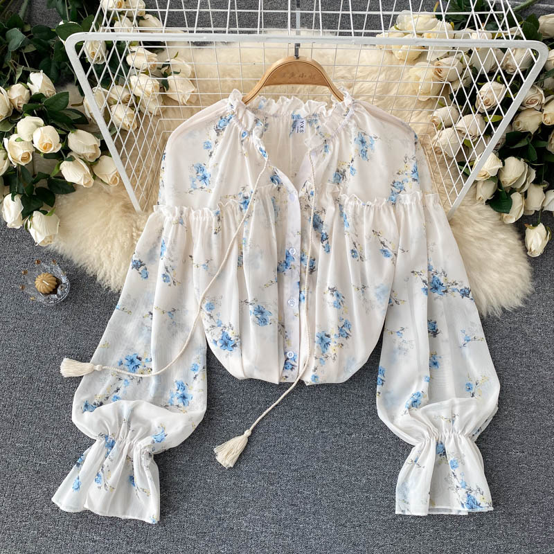 White Floral Loose Blouse For Women Autumn Casual Flare Long Sleeve Single Breasted Tassel Shirt Female Sweet Tops New