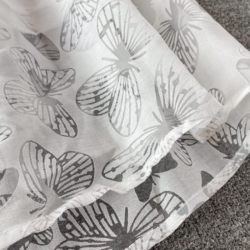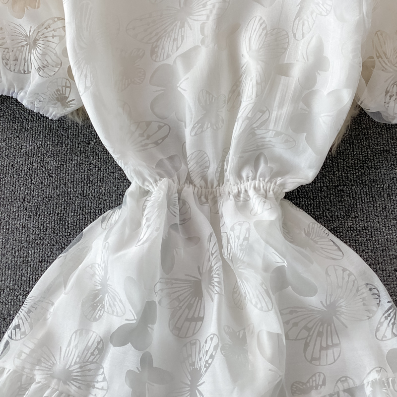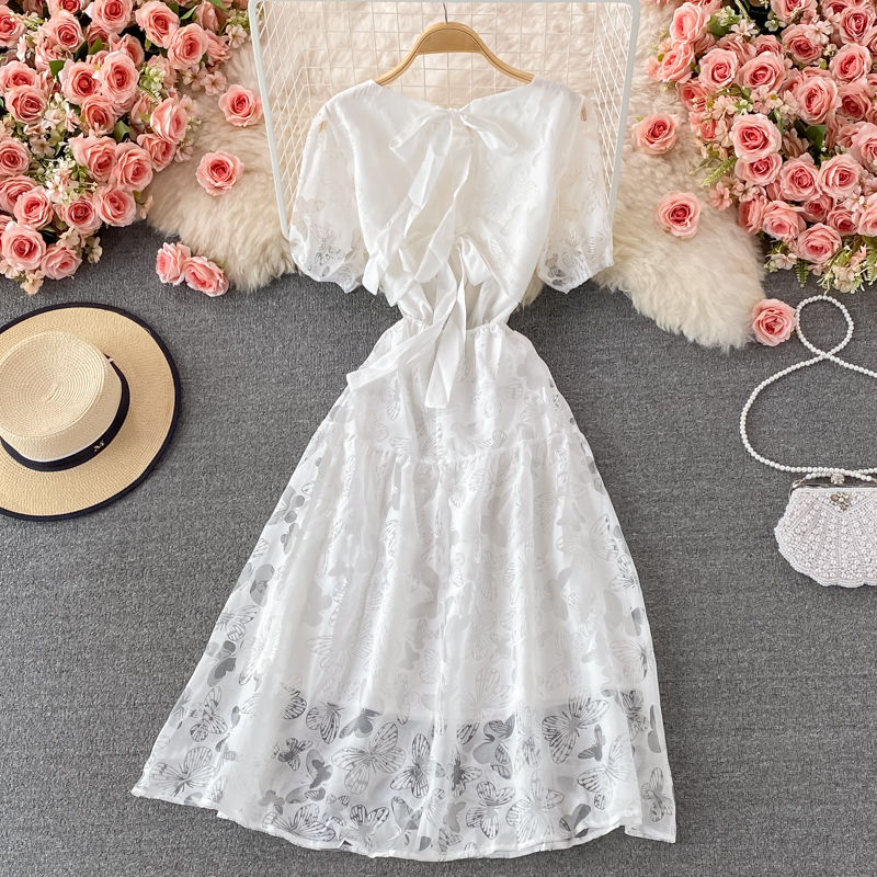 Sweet White Midi Dress For Women Summer Round Neck Short Sleeve Butterfly Pattern Vestidos Female Bow A-Line Robe Fashion