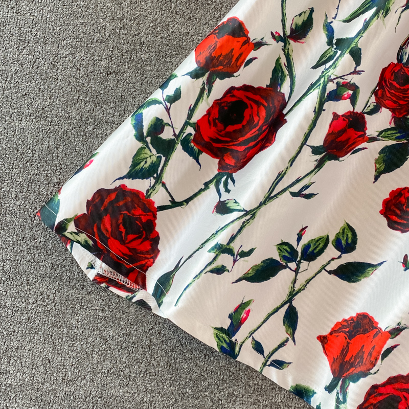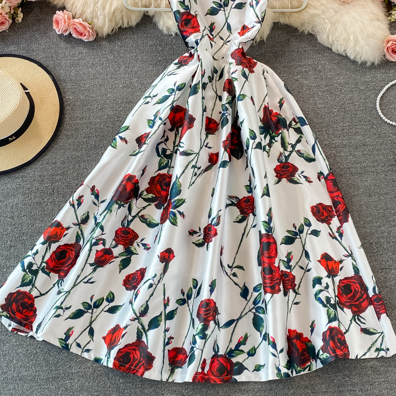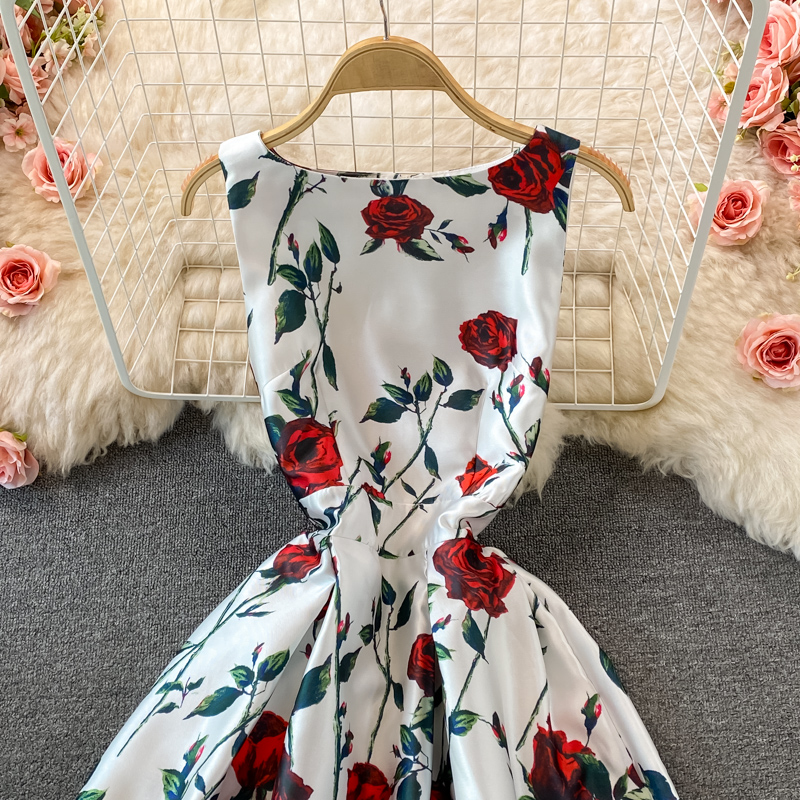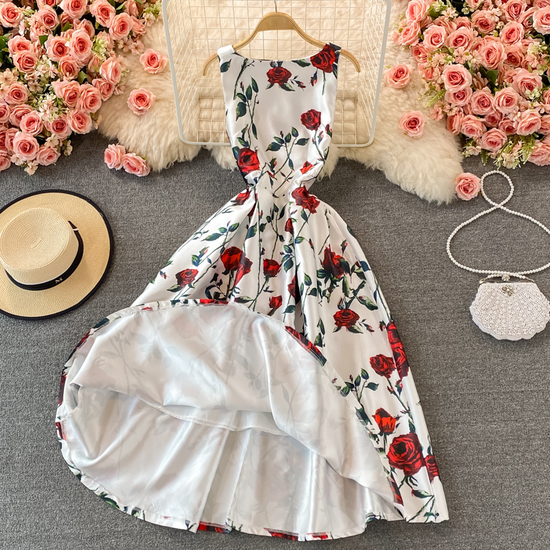 Women Red Floral Long Dress Summer Bohemian O-Neck Sleeveless High Waist A-Line Sleeveless Vestidos Casual Party Robe New
