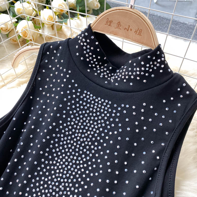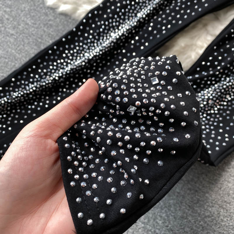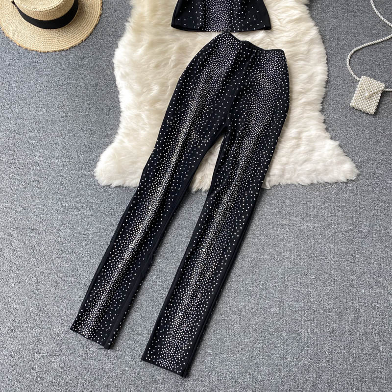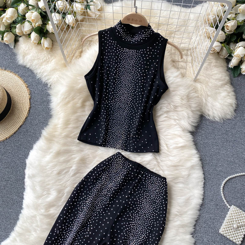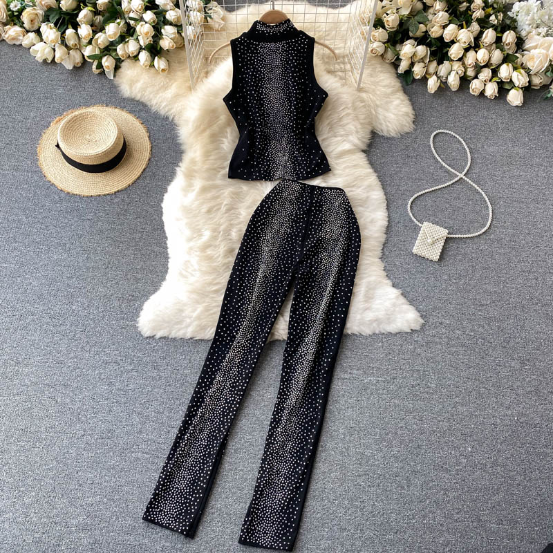 Black Two Piece Set Women Elegant Stand Collar Sleeveless Tops + High Waist Pencil Pants Diamonds Party Suits Vintage New