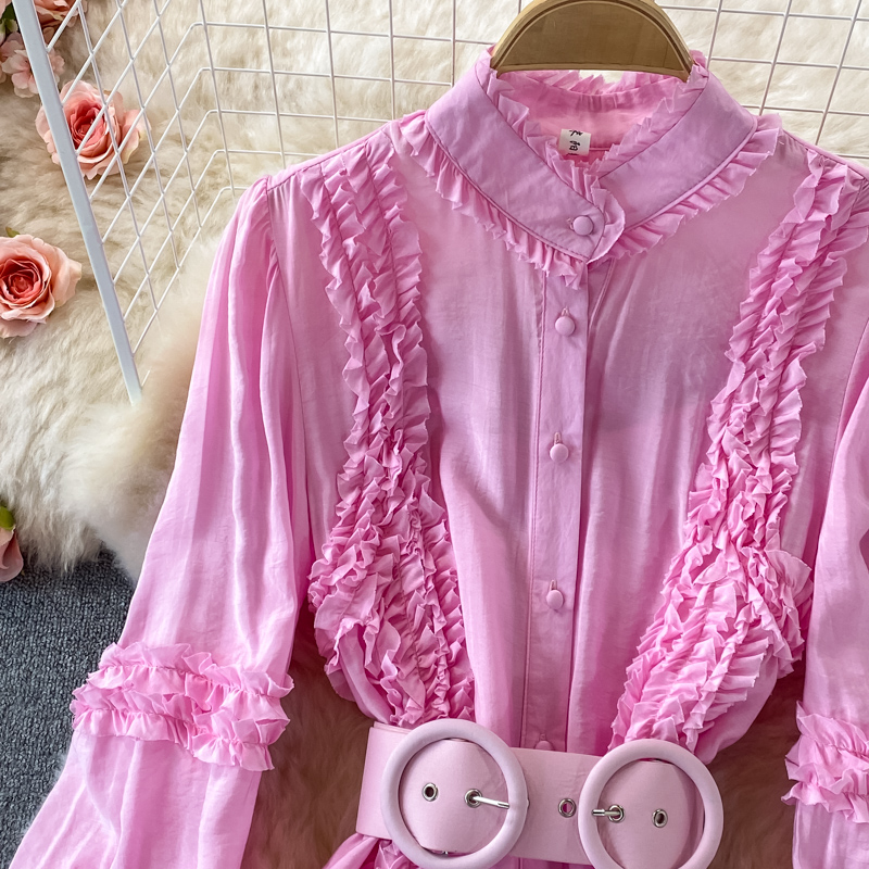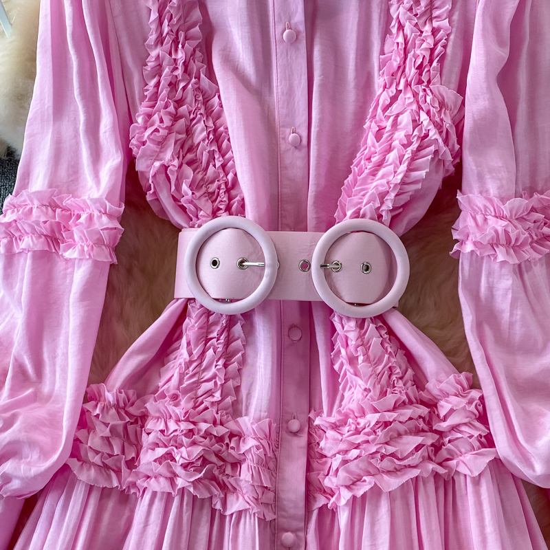 Autumn Green/Pink/White Party Long Dress For Women Vintage Stand Collar Maxi Vestidos Ruffle Patchwork Single Breasted Robe