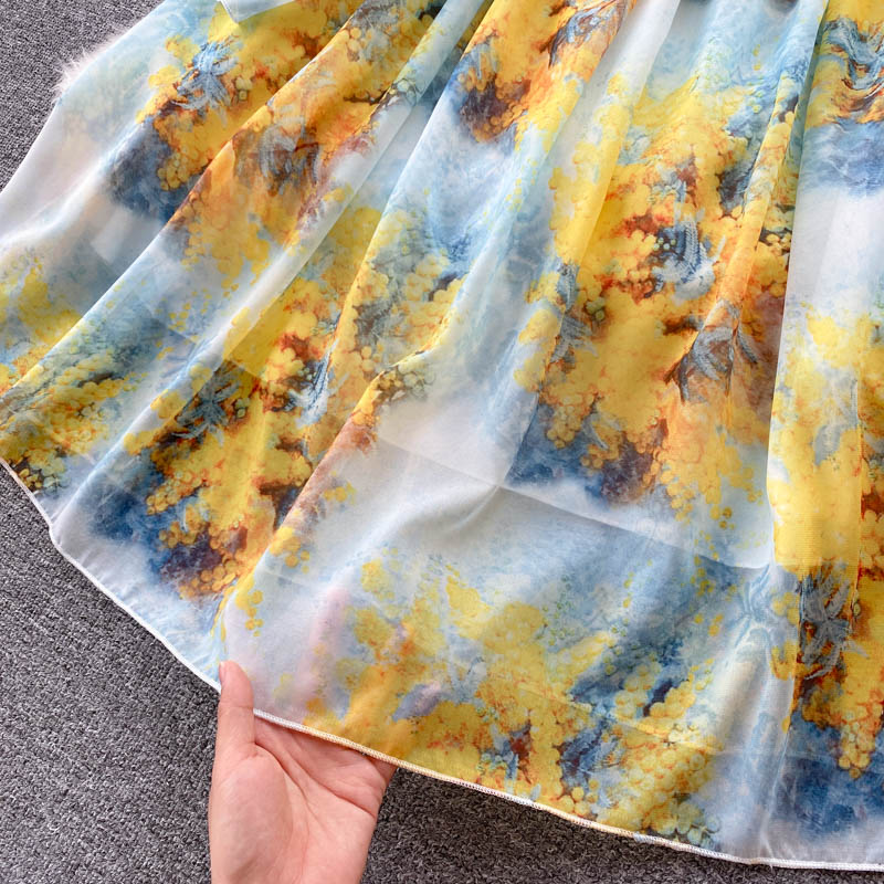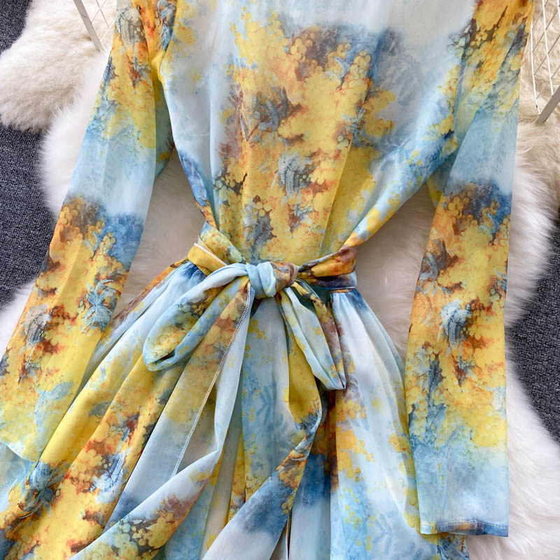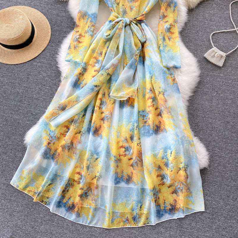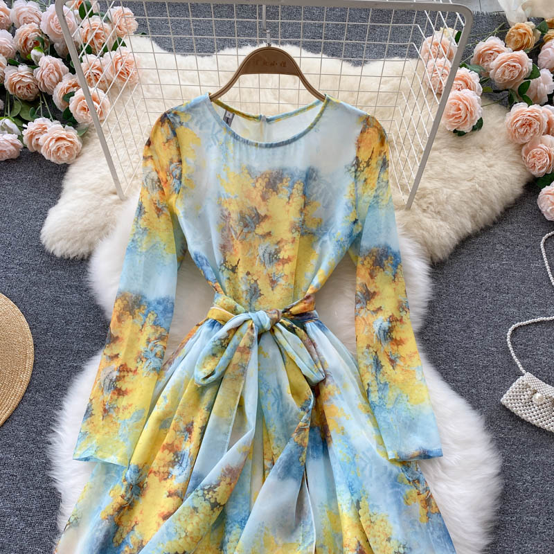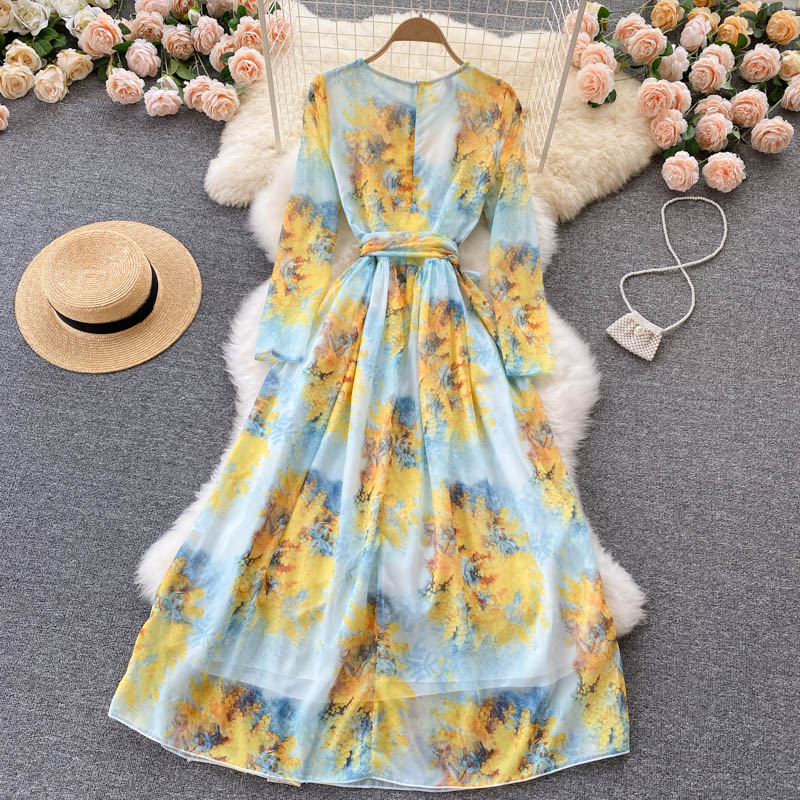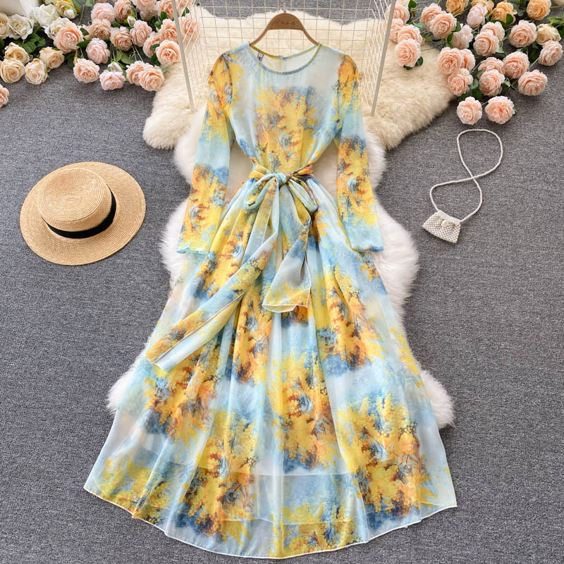 Autumn Bohemian Floral Chiffon Long Dress For Women Elegant Round Neck High Waist A-Line Printed Maxi Vestidos Lady Robe
