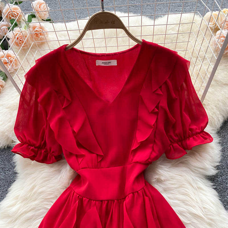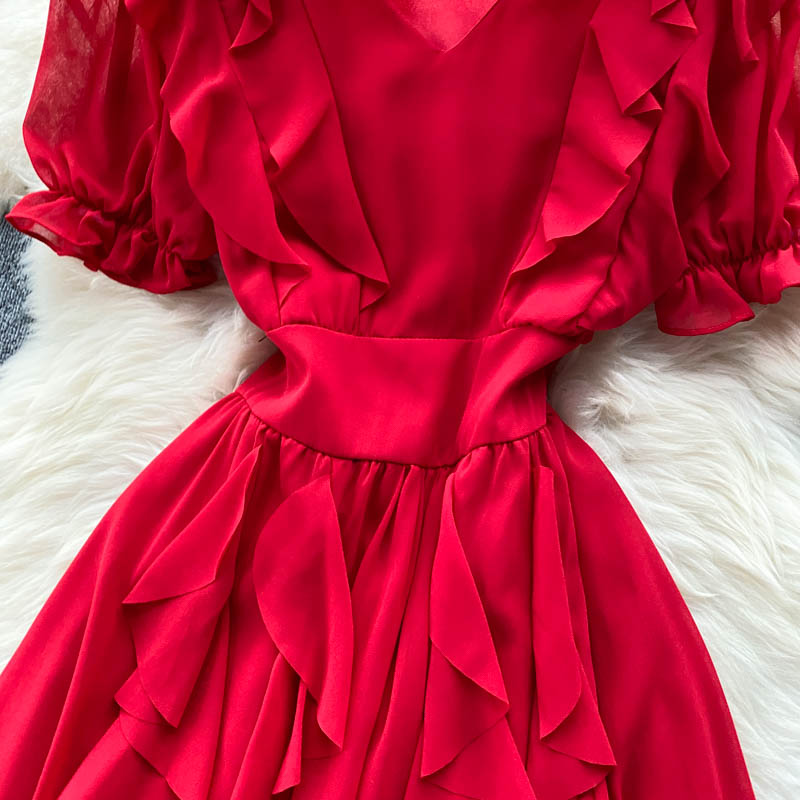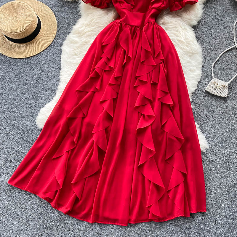 Vintage Women Chiffon Long Dress Elegant Ruffle Short Sleeve High Waist A-Line Vacation Beach Maxi Vestidos Female Fashion