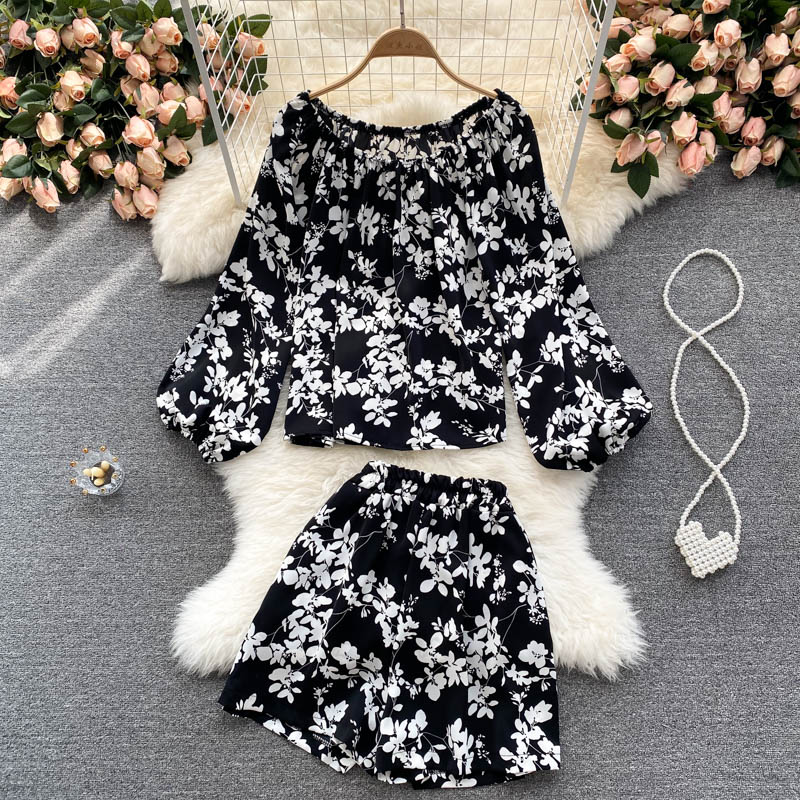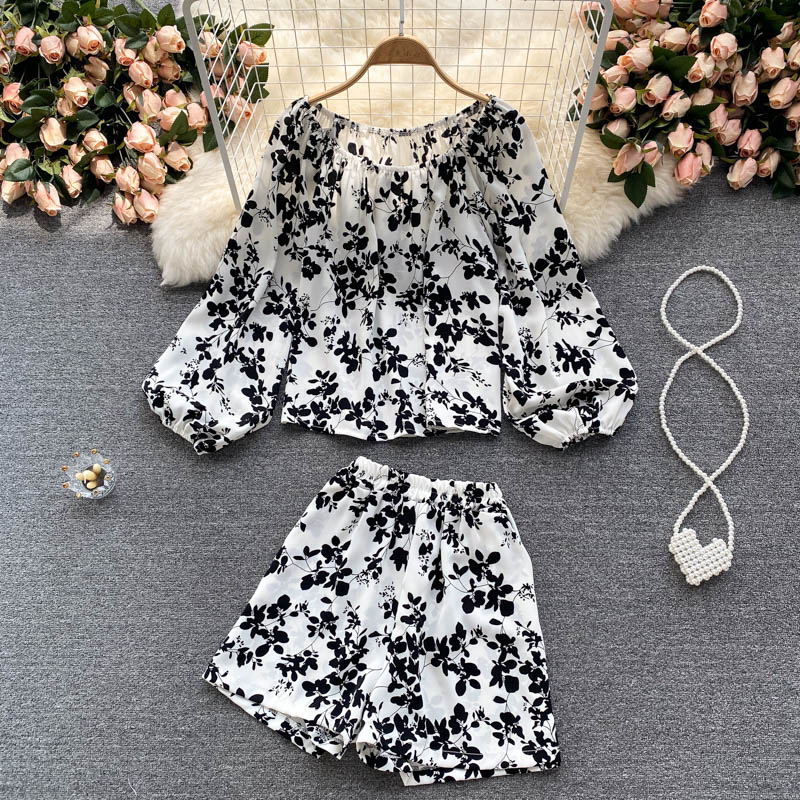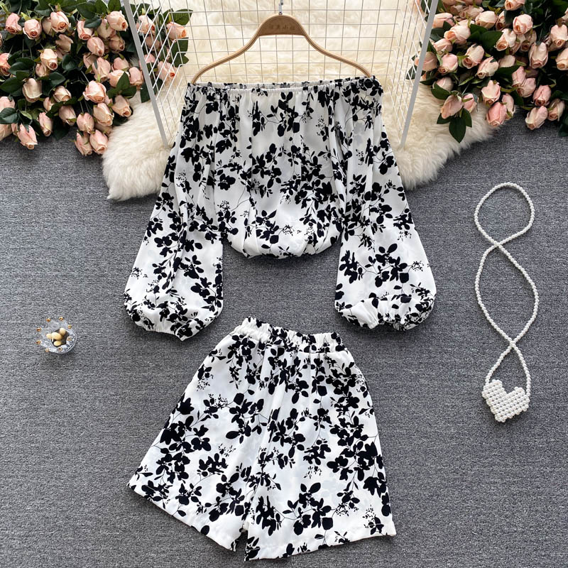 Cheap Women’s Sets, Buy Quality Women’s Clothing Directly from China Suppliers:Summer Black/White Printed Two Piece Set For Women Sexy Slash Neck Puff Long Sleeve Shirt + Wide Leg Shorts Suit Female New