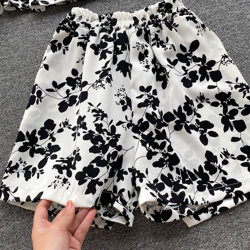 Summer Black/White Printed Two Piece Set For Women Sexy Slash Neck Puff Long Sleeve Shirt + Wide Leg Shorts Suit Female New