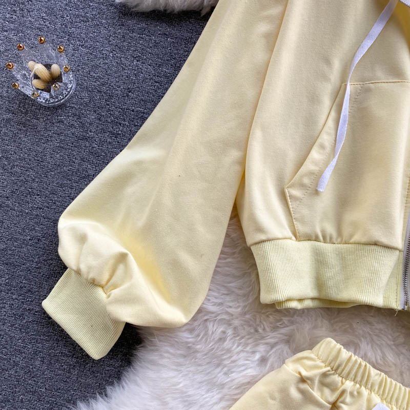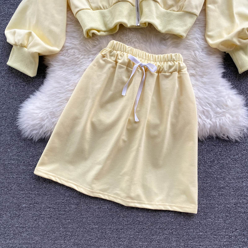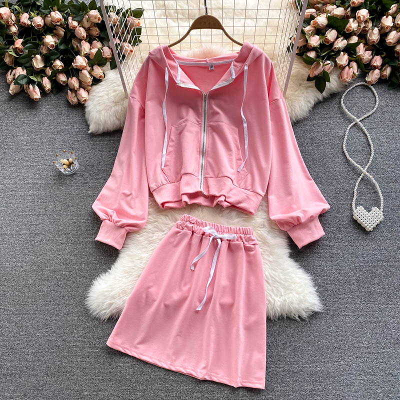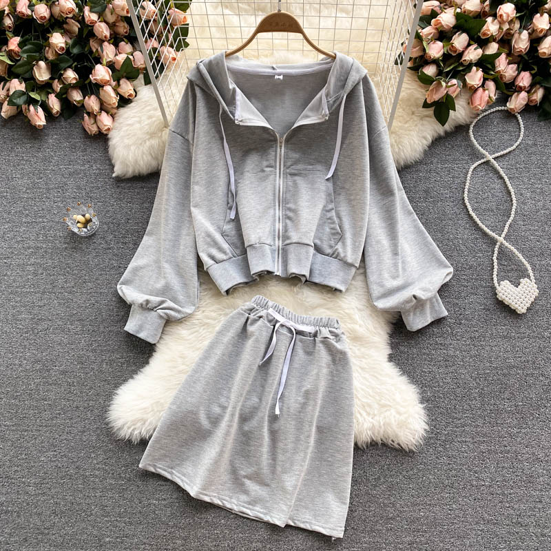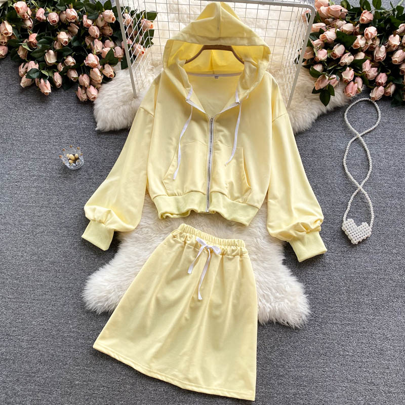 Gray/Yellow/Pink Two Piece Set Women Hooded Zipper Cardigan Sweatshirt + High Waist Mini Skirt Sport Suit Lady New Fashion