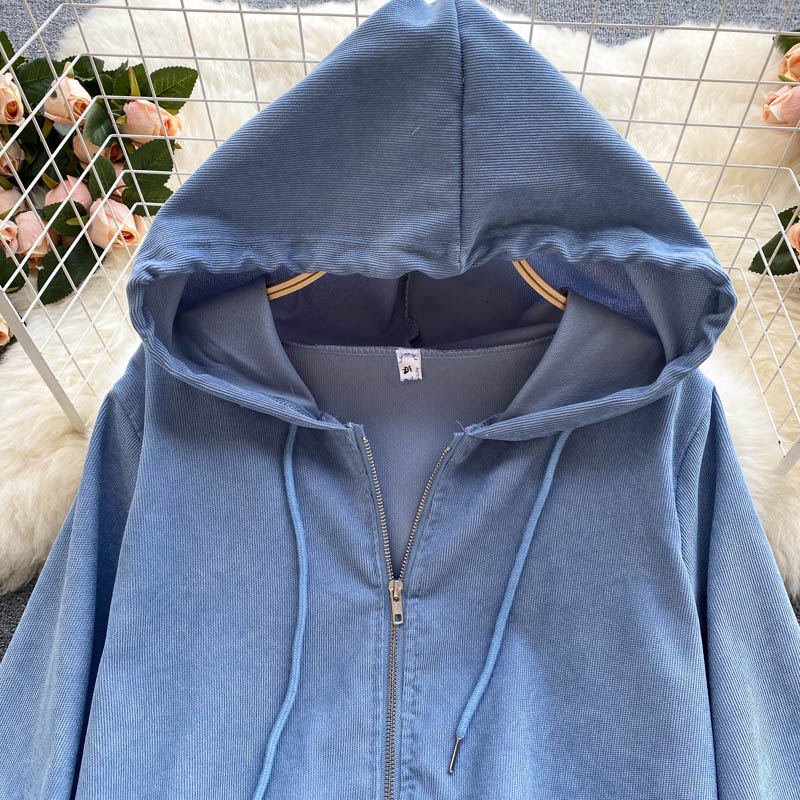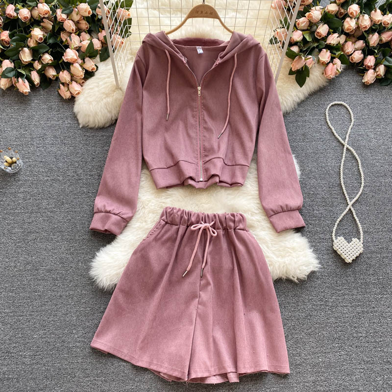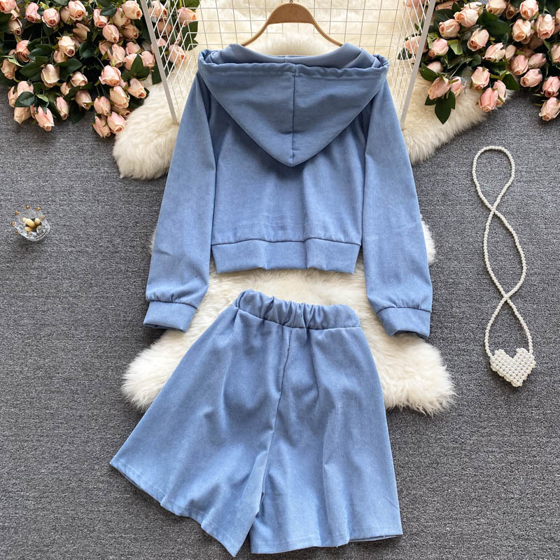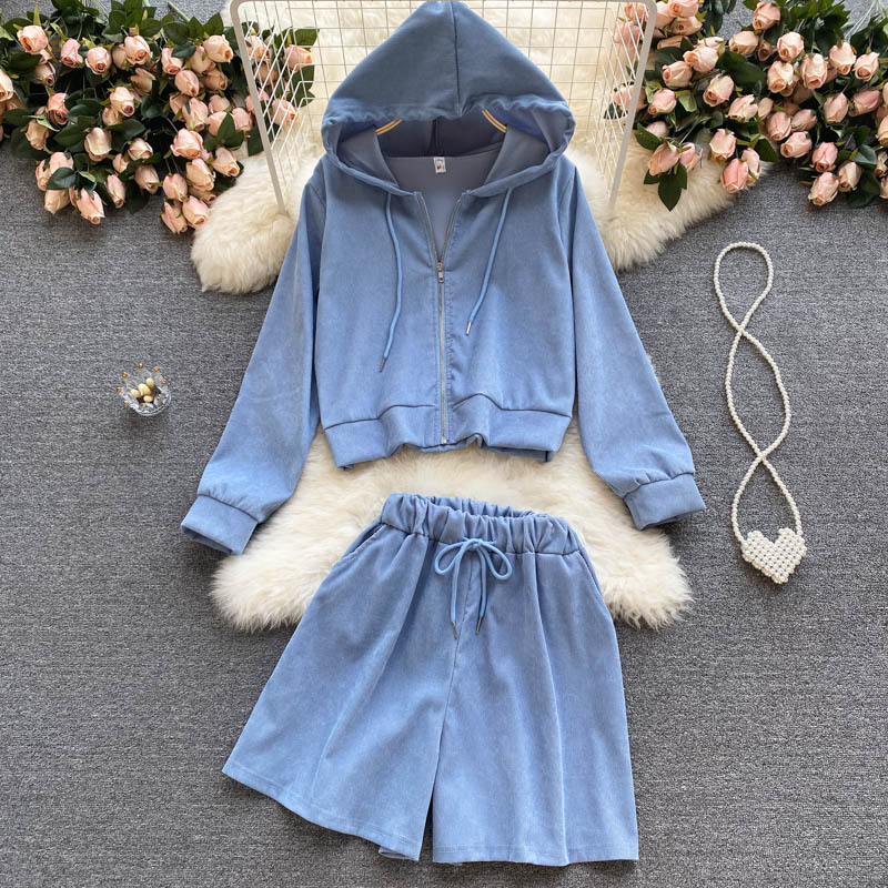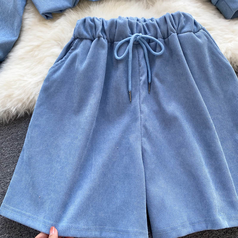 Women Casual Blue/Pink/Black Two Piece Set Female Hooded Cardigans Sweatshirt And Wide Leg Drawstring Shorts Sport Suit New