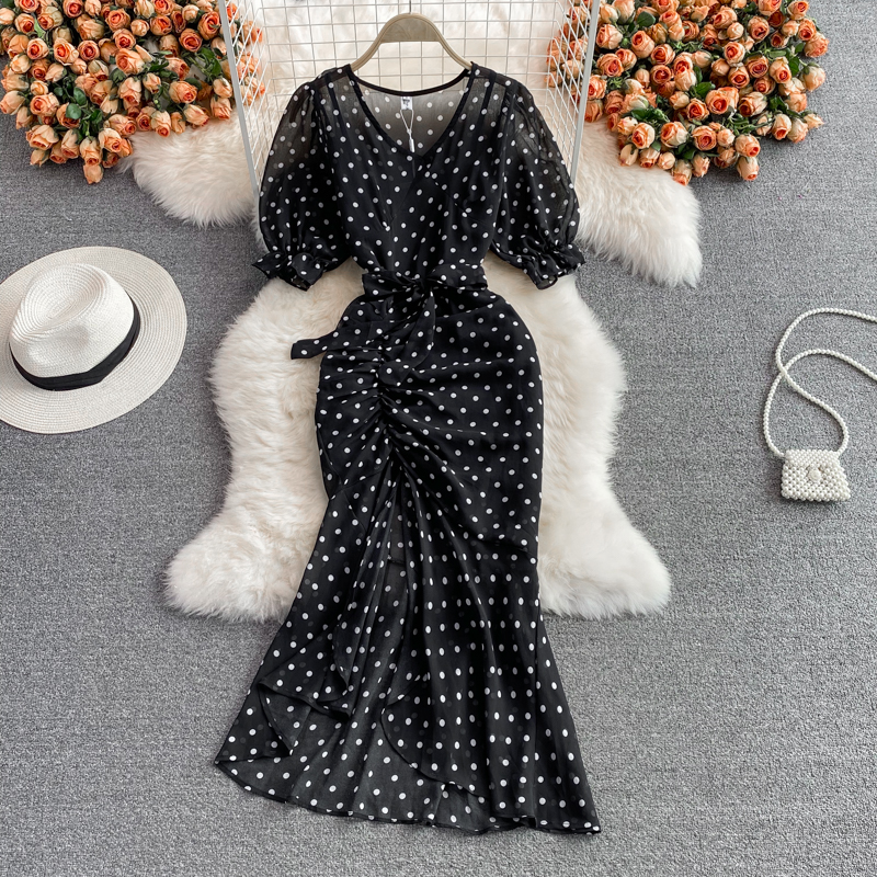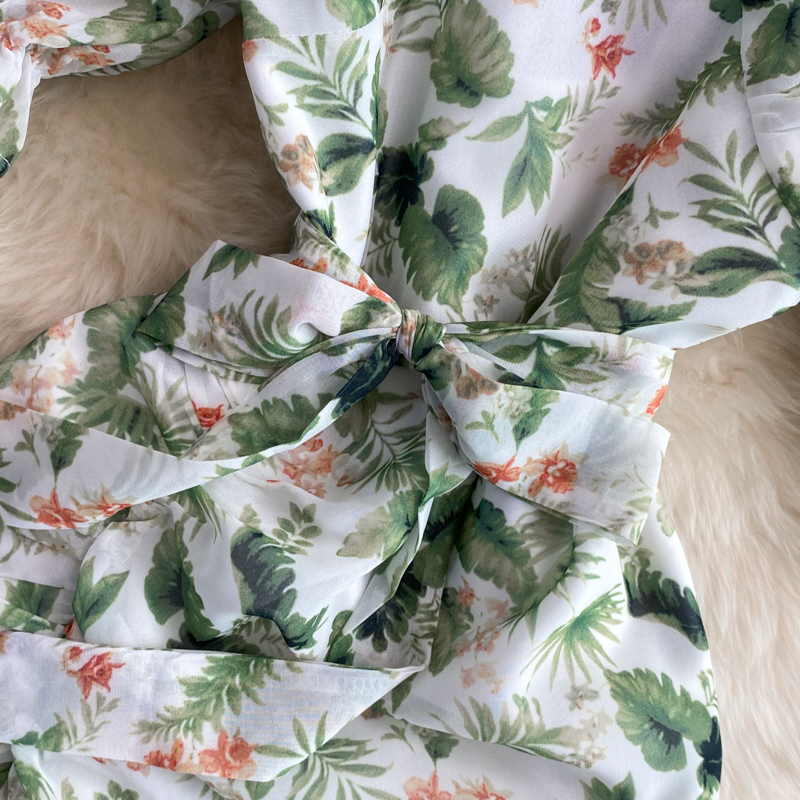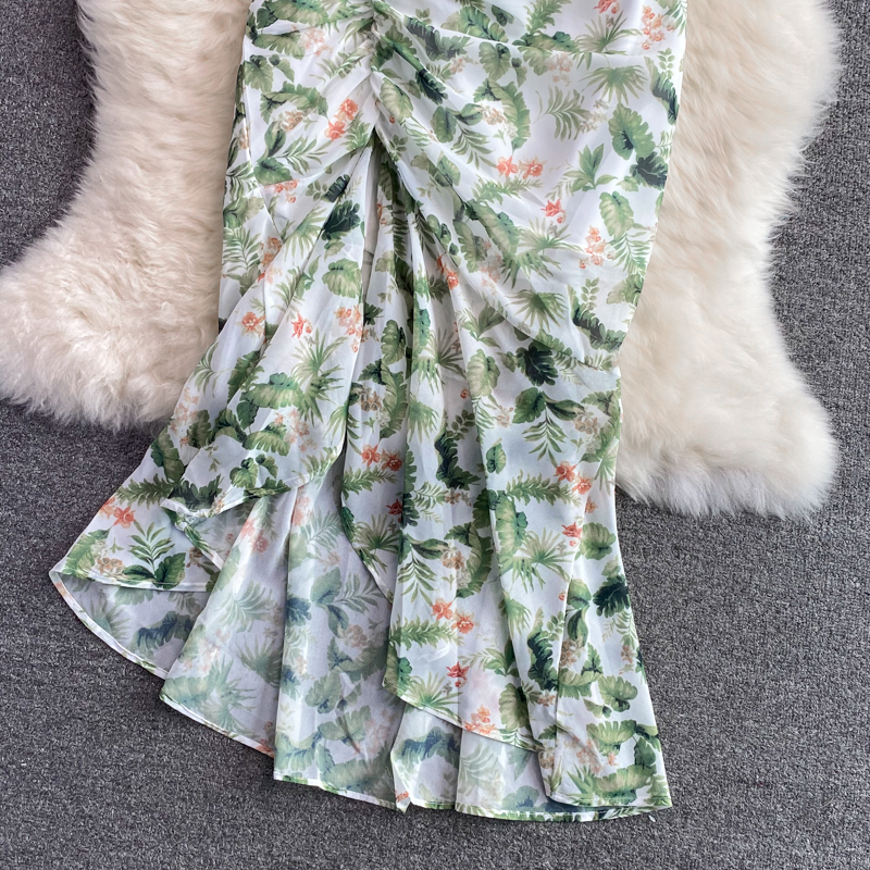 Bohemian Green/Black Women Floral Irregular Long Dress Summer Sexy V-Neck Short Puff Sleeve High Waist Trumpet Vestidos Female