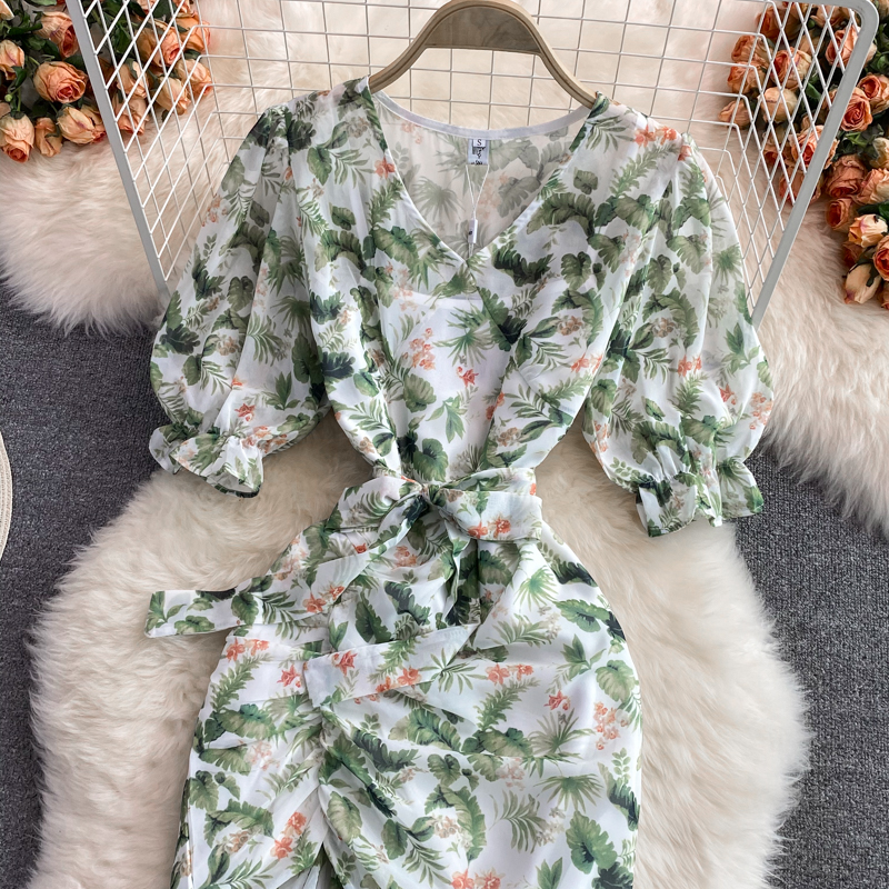Cheap Dresses, Buy Quality Women’s Clothing Directly from China Suppliers:Bohemian Green/Black Women Floral Irregular Long Dress Summer Sexy V Neck Short Puff Sleeve High Waist Trumpet Vestidos Female