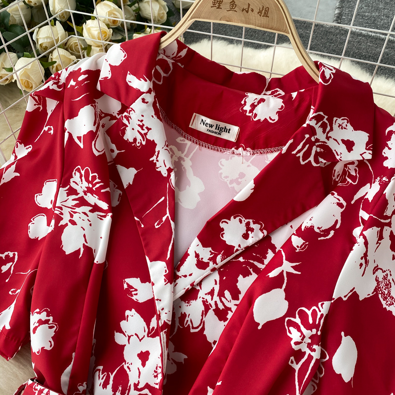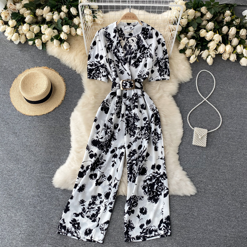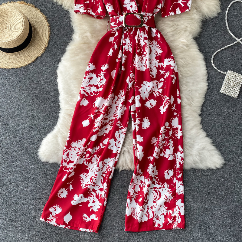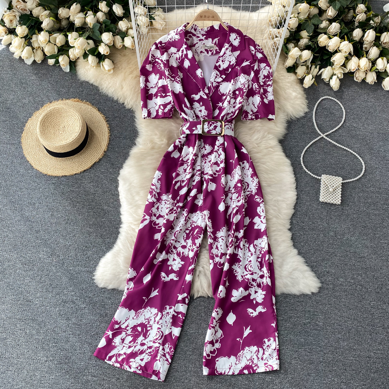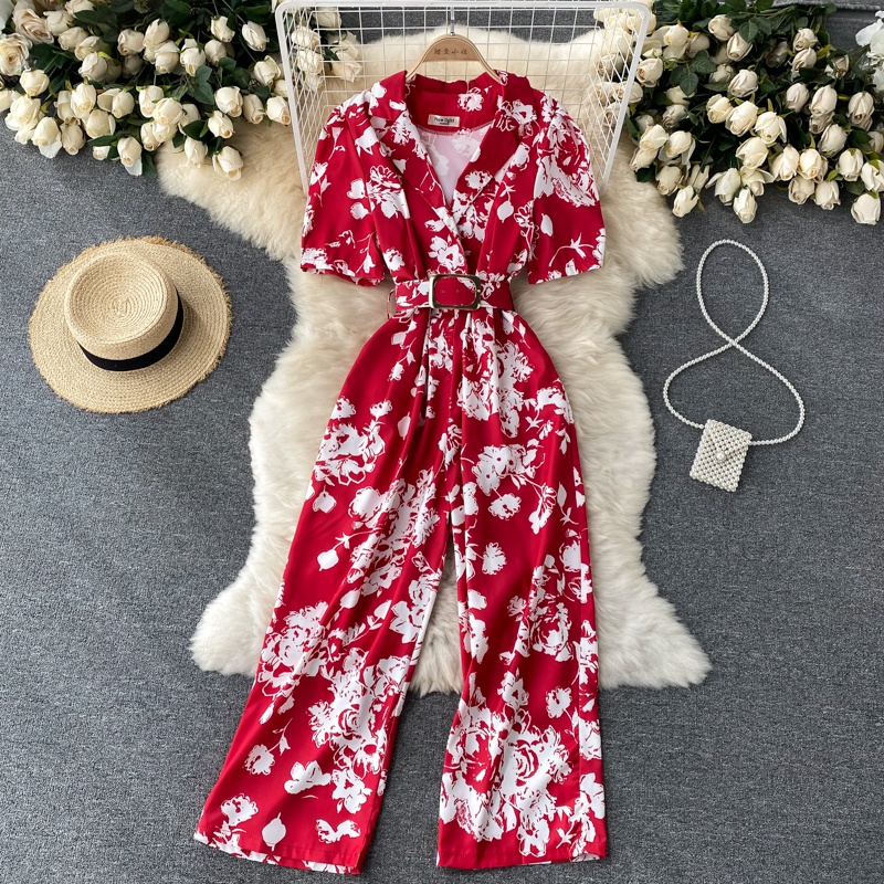 Red/Purple/White Mono Print Romper Women Summer Vintage Notched Collar Short Sleeve High Waist Wide Leg Jumpsuit Female New