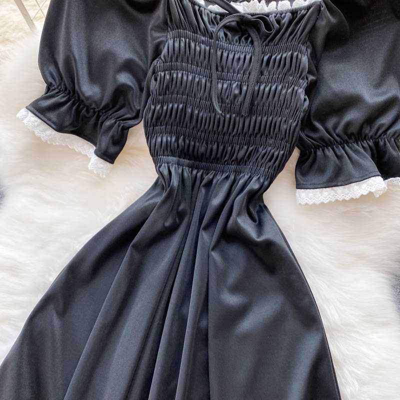 Sweet Black Square Collar Lace Patchwork Black Dress Summer Elegant Short Puff Sleeve High Waist Draped Vestidos Female New