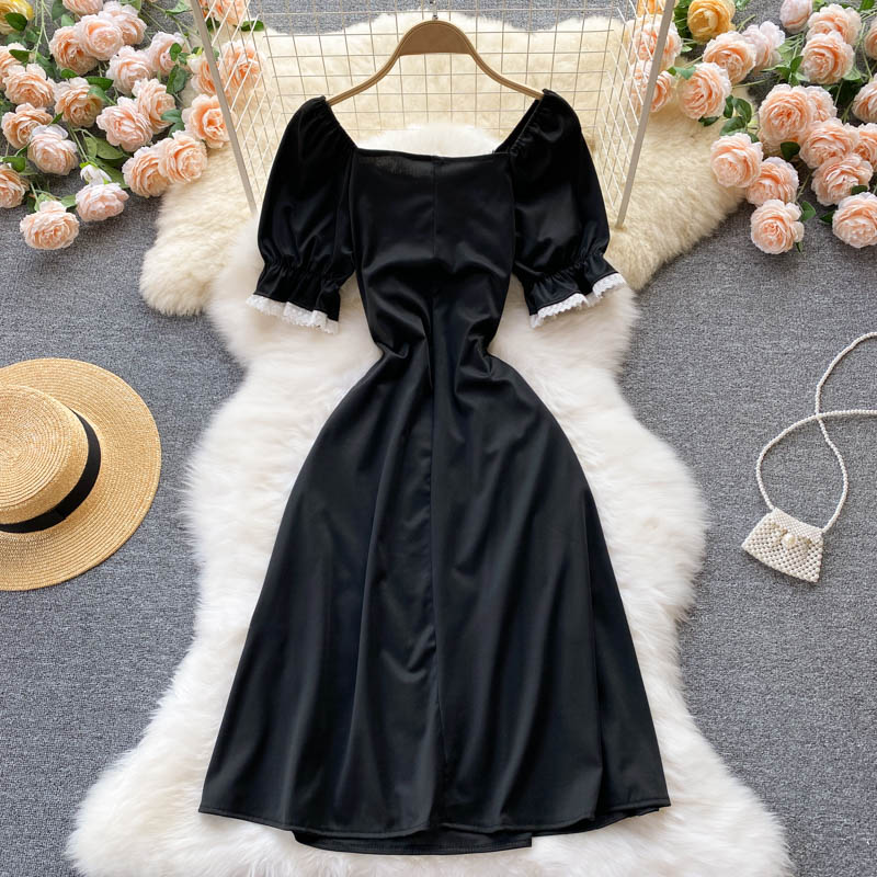 Cheap Dresses, Buy Quality Women’s Clothing Directly from China Suppliers:Sweet Black Square Collar Lace Patchwork Black Dress Summer Elegant Short Puff Sleeve High Waist Draped Vestidos Female New