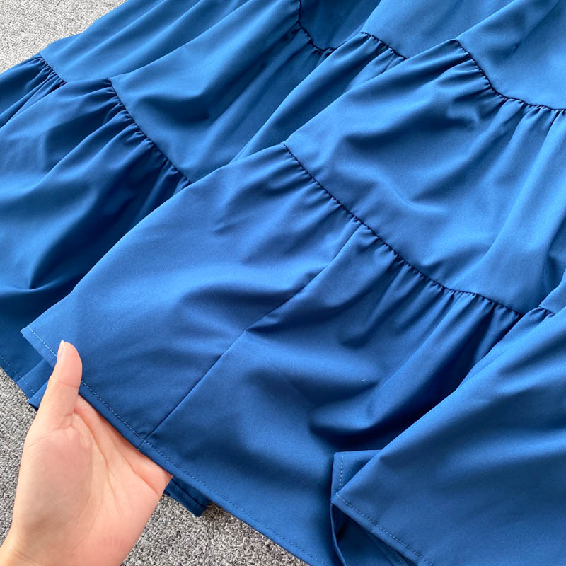 Vintage Blue Ruffled Collar Midi Dress Women Summer Elegant Sleeveless Loose Vestidos Female Ruffle Casual Bandage Robe New