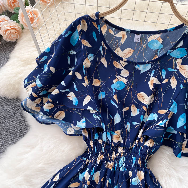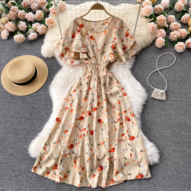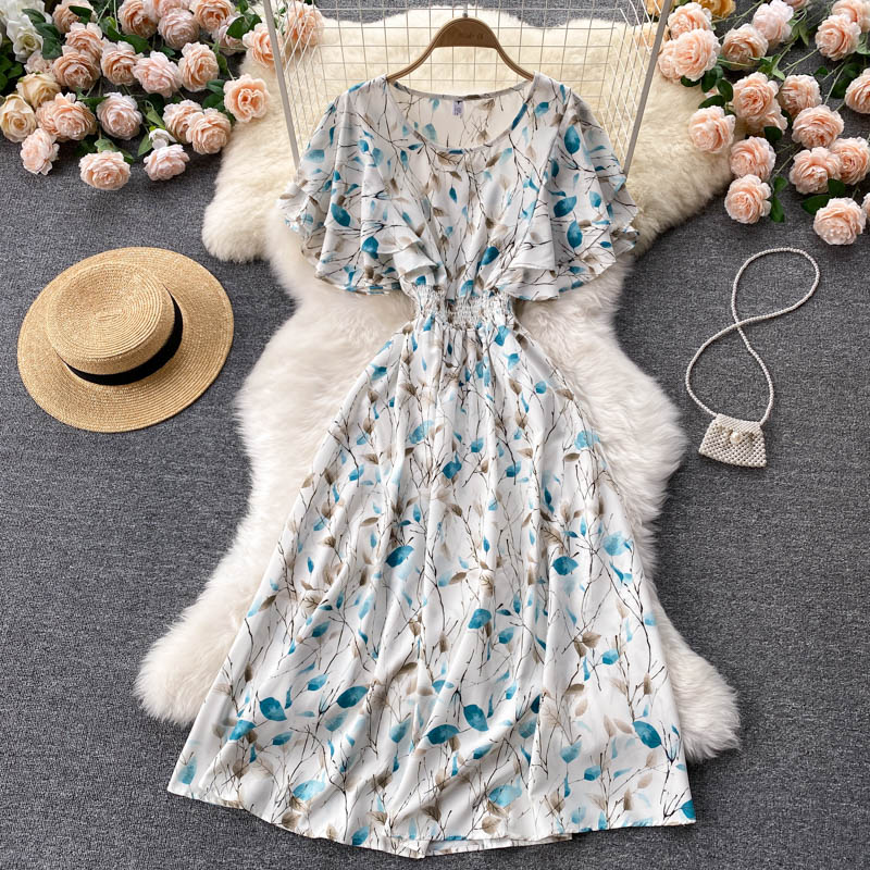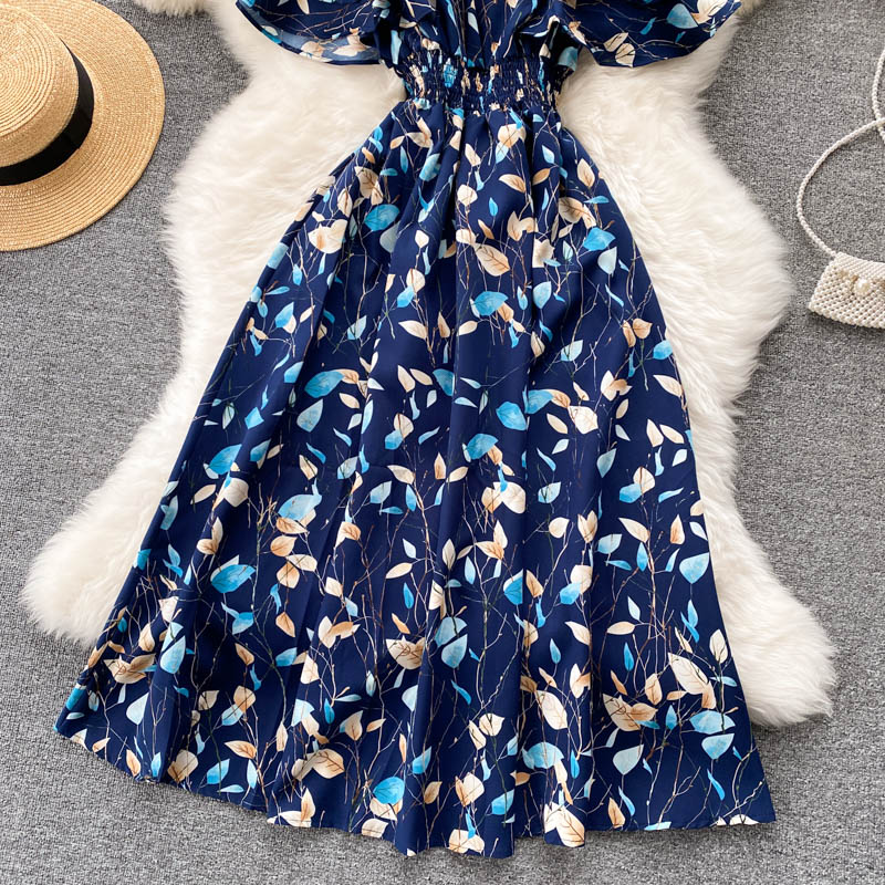 Bohemian Floral Chiffon Midi Dress Women Sexy Slash Neck Ruffle Short Sleeve A-line Printed Vacation Beach Vestidos Robe