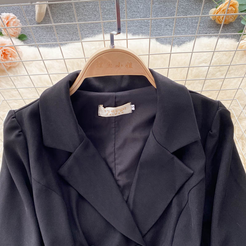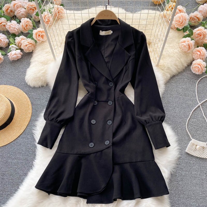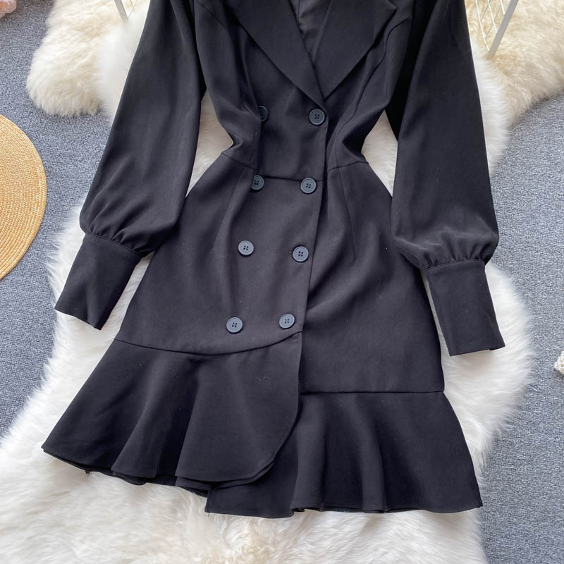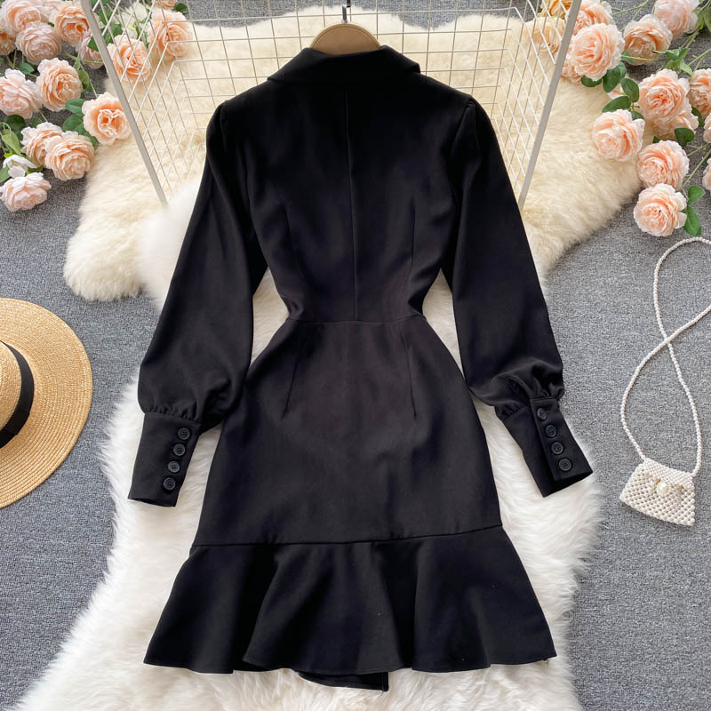 Autumn Vintage Black Double Breasted Ruffle Mini Dress Casual Notched Collar Lantern Long Sleeve High Waist Loose Outerwear