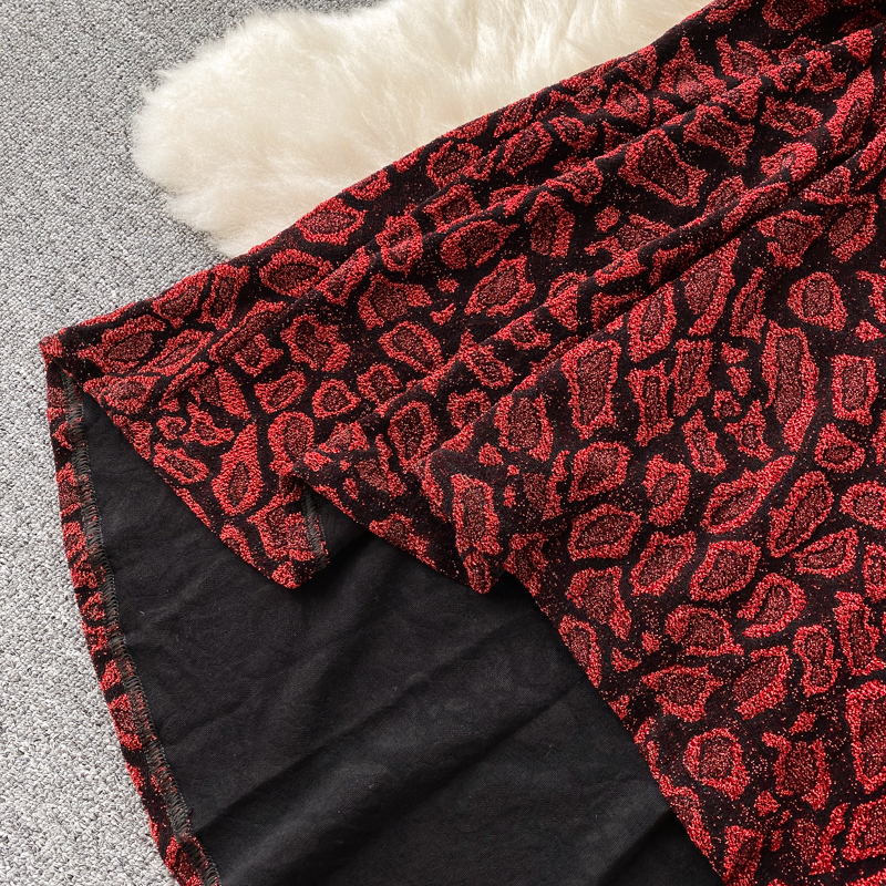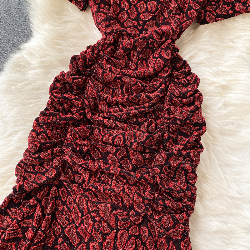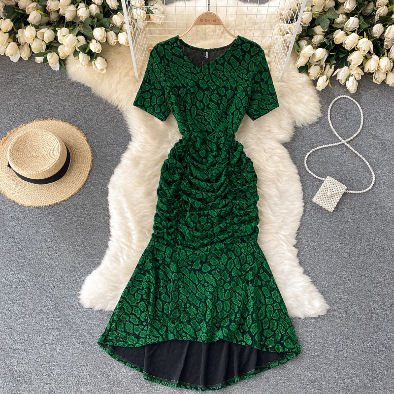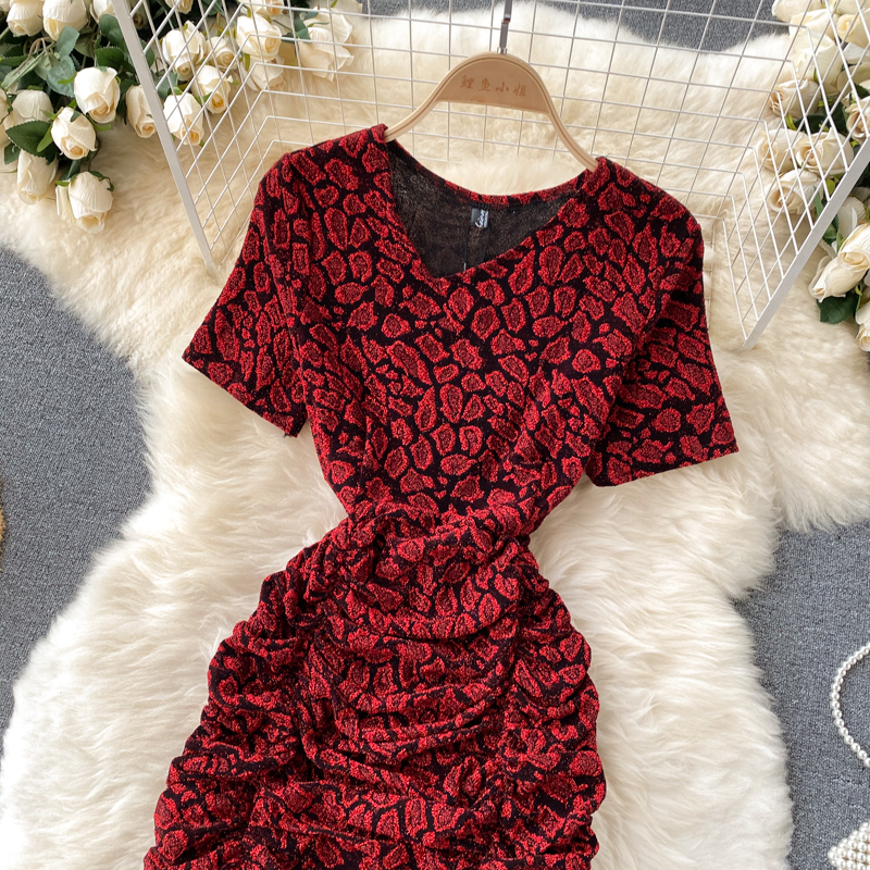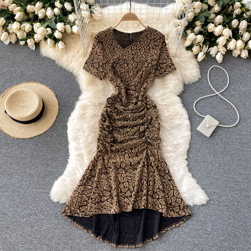 Green/Red/Khaki Leopard Draped Midi Dress Women Summer Irregular V-Neck Short Sleeve High Waist Mermaid Vestidos Female New